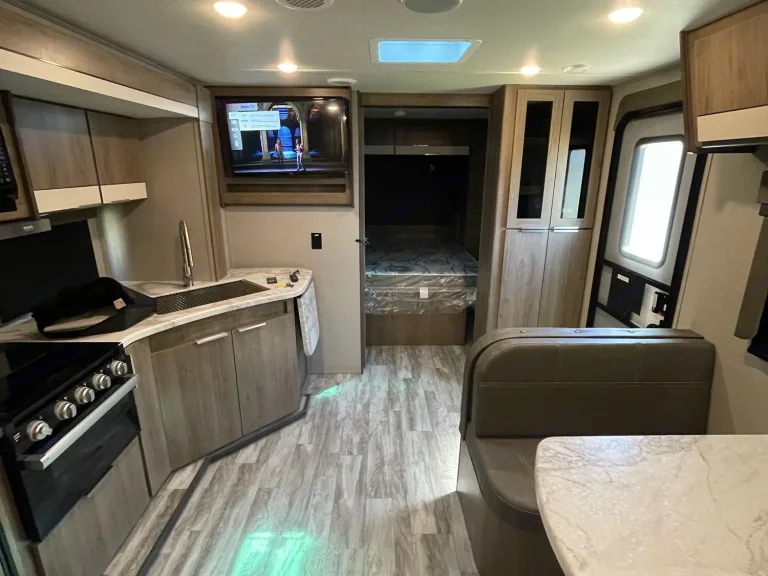 Fully equipped with a queen-sized bed and 2 full size bunk beds, sink, induction stove, oven, microwave, ventilation Ac and heater. Storage space underneath for all of your adventure gear! Has 2 grey water tanks and one black water tank with fresh water that holds 40 gallons. Weight distribution hitch, water filter (you may supply your own if wanted), and 30 amp gfci electric hookup included!This rig is also jam-packed with high-end components, Smart TV, Bluetooth, DVD player. Also has an outdoor Kitchen with 1 burner Blackstone!