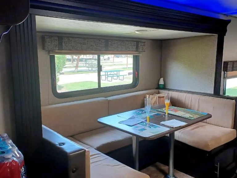 Like new Grey Wolf travel trailer to comfortably fit anyone's glamping style. Has a Queen size bed with curtain for privacy but also a dinette that transforms into bed to comfortably sleep 4 persons. One slide out for the dinette to make the trailer spacious unlike other small trailers. Large counter space for food prep and cooking. Kitchen is fully stocked with essentials to cook meals. Tons of storage space for chairs and portable bbq. Also included is a electric awning for shade in the summer days. This rental comes with weight distribution hitch/bars for easier towing. What's includedWe provide you with: