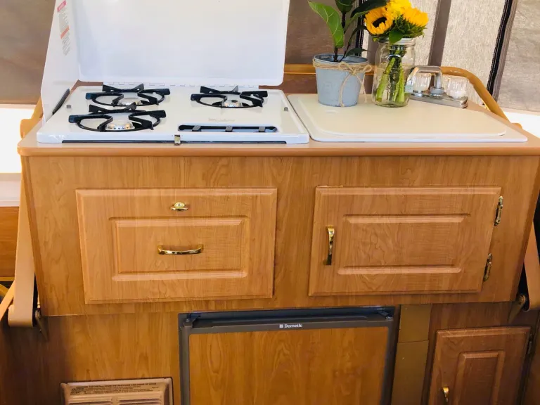 -Basic Cleaning suppliesThe kitchenette is equipped with a stove (you may use 5-gallon propane tank for additional fee),mini-fridge (requires electric hook-ups), and a sink.For dry camping, the trailer has a 5-gallon propane tank (add-on)* Please note: trailer does not have a shower, make sure you camp on a location with shower facilities.