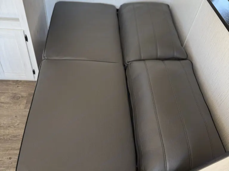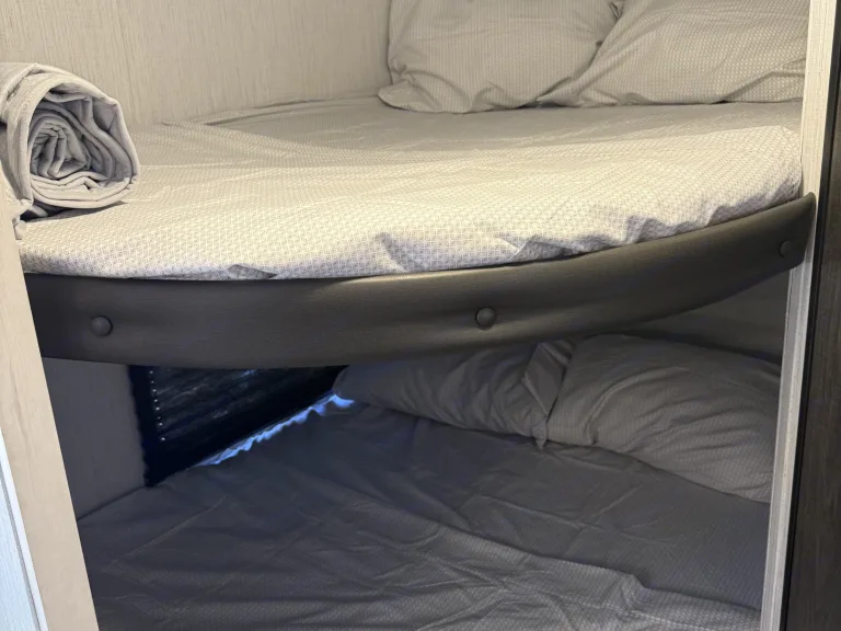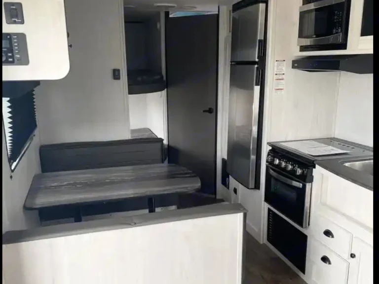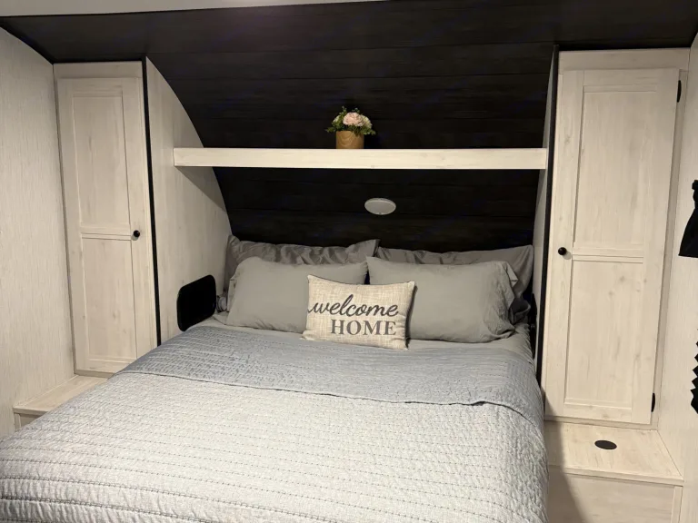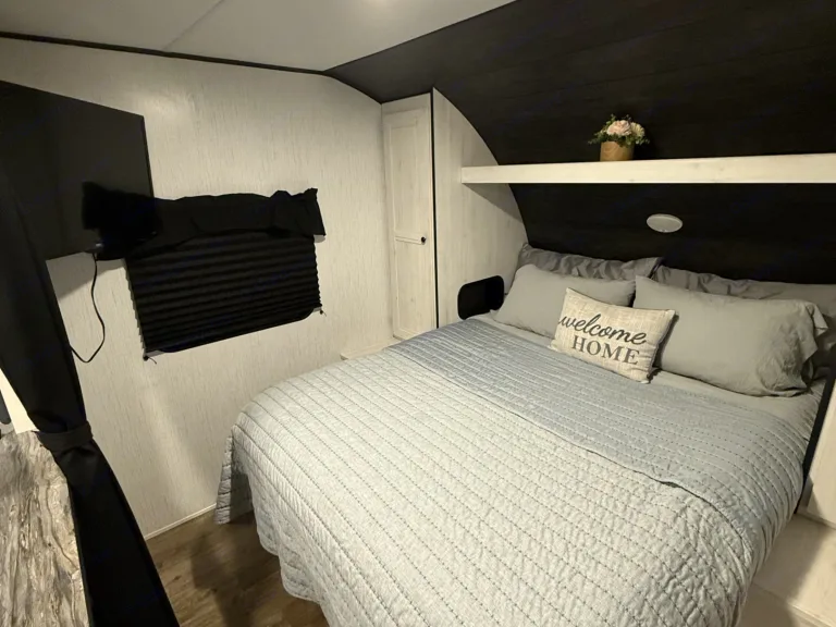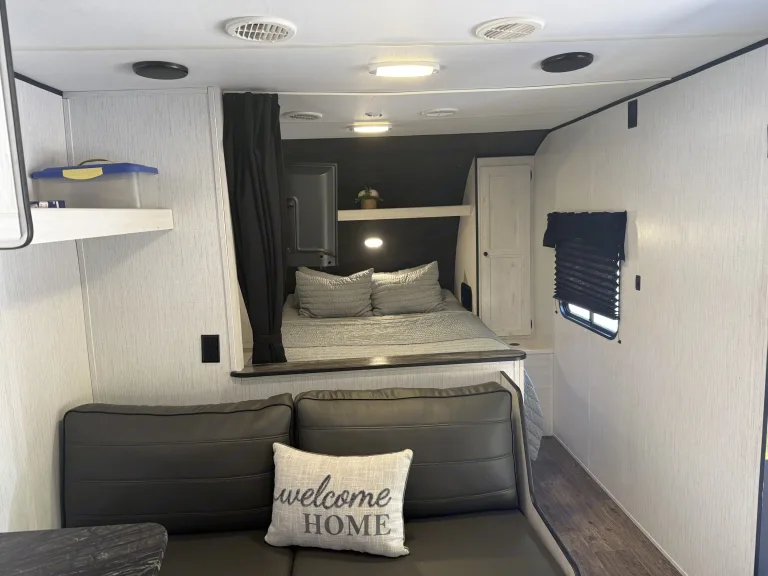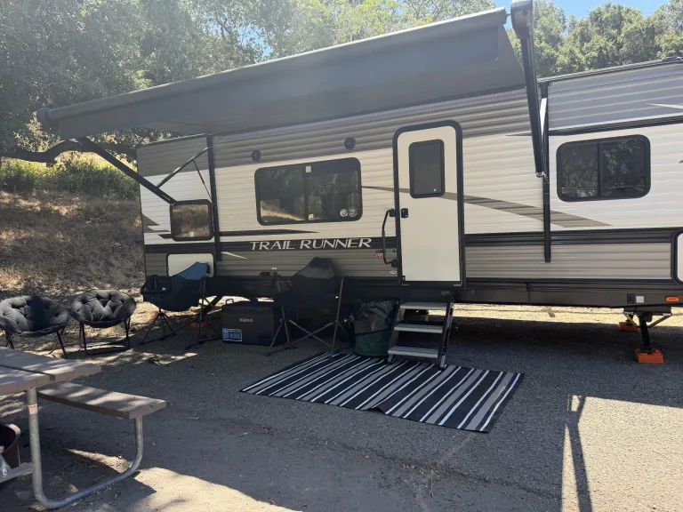 - **Outdoor Living:** Equipped with an awning, outside shower, outside rug, table with benches and 4 camp chairs, and a trash can. What's included• Bed linens, pillows