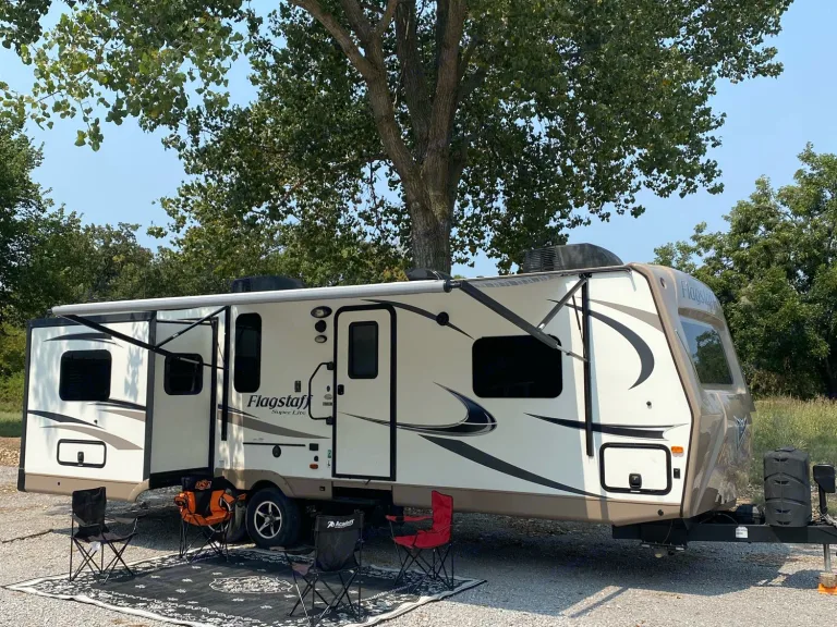 2017 Flagstaff Super Lite bumper pull travel trailer. Featuring a queen sized bed, fold out couch, and dinette conversion for a comfortable nights sleep. This travel trailer has two A/C units for optimal cooling, a gas/electric heater and an electric fireplace. The kitchen includes a full sized sink, refrigerator/freezer, oven, a 3 burner gas stove and a microwave. The gas/electric water heater insures hot water in the stand up shower.This travel trailer has a Bluetooth capable sound system with speakers inside and outside. The flatscreen tv is equipped with satellite that will connect you with local TV channels and it is Hdmi/USB compatible for other entertainment. The outdoor awning provides a shady spot for the hot, sunny days.Delivery, set-up, and pickup is recommended for a hassle free getaway.What's includedThe following items are included at NO EXTRA CHARGE!-Gray/black water dumping
