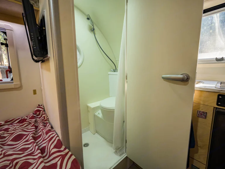 The trailer has an amazing radiant heating system to keep you warm, even if it's below freezing outside. For cooling the vent fan works great, and for really hot days there's even A/C (when hooked up to shore power).----
