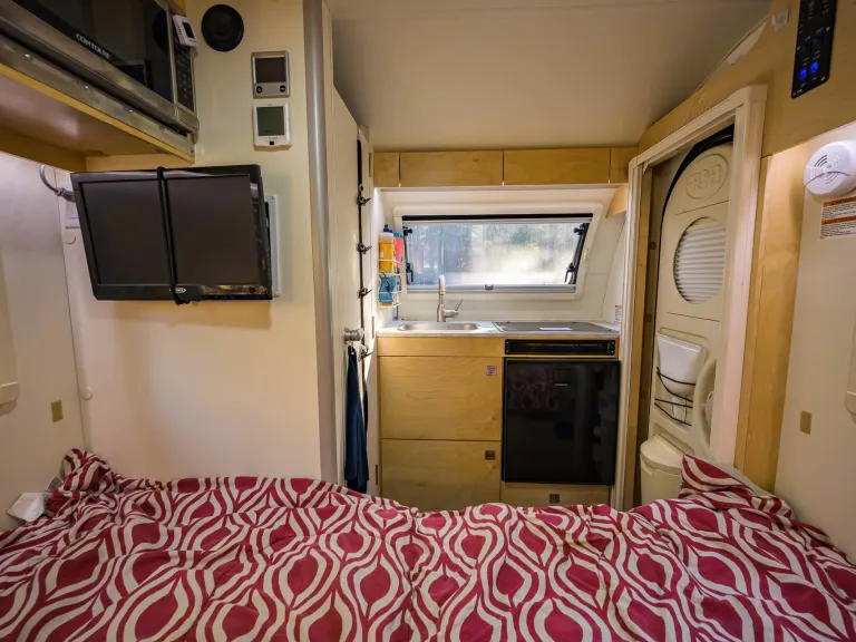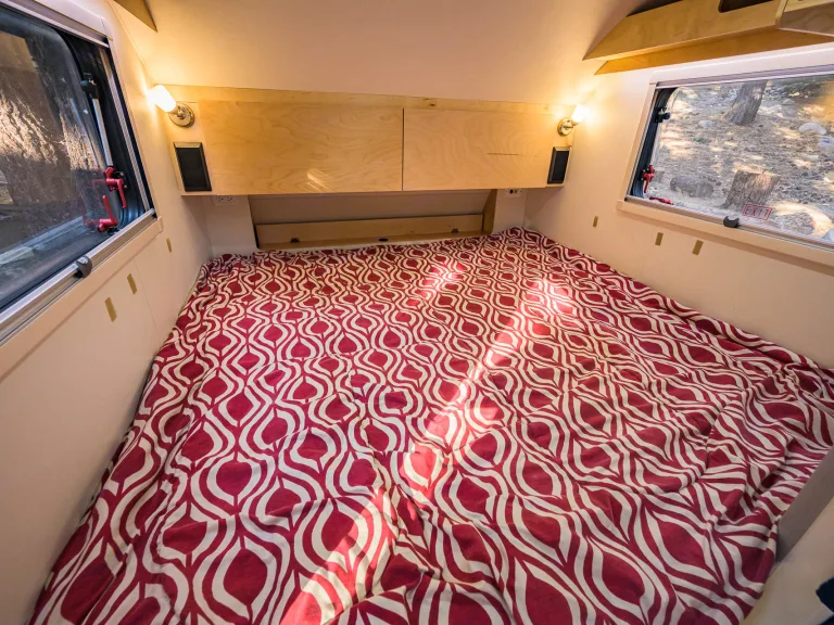 So many nice touches in this teardrop! Reading lights, clothes storage, Bluetooth sound system, 400W of solar for boondocking.----