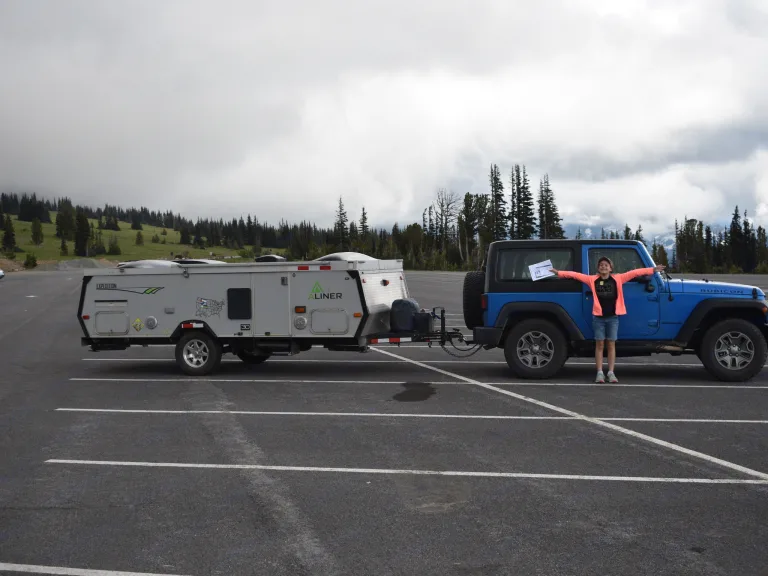 Aliner Expedition that sleeps 3-4 and has wet bath.Off-road package for additional ground clearance (no off-road trips, please)Dry weight if 1850 lbs and can be towed by most vehicles.11 gal fresh water tank and 6 gallon propane water heater for a 17 gallon total capacity.Cassette toilet has its own water supply and black tank accessible from a compartment on the door-side.Pop-up camper weight and aerodynamics with full sized trailer interior and amenities. Hard sides make this a perfect pop-up for campsites that do not allow soft-side campers due to wildlife concerns.This Expedition has custom woodwork in place of a stock trailer’s dinette that allows a twin bed and room below for a 4th person or bins to store some of your gear.A/C window unit conveniently mounted keep you cool when you have shore power or a generator connected.Dual propane tanks.3 cubic foot domestic refrigerator that runs on A/C or propane or can keep its temp on 12 volt power while en route.
