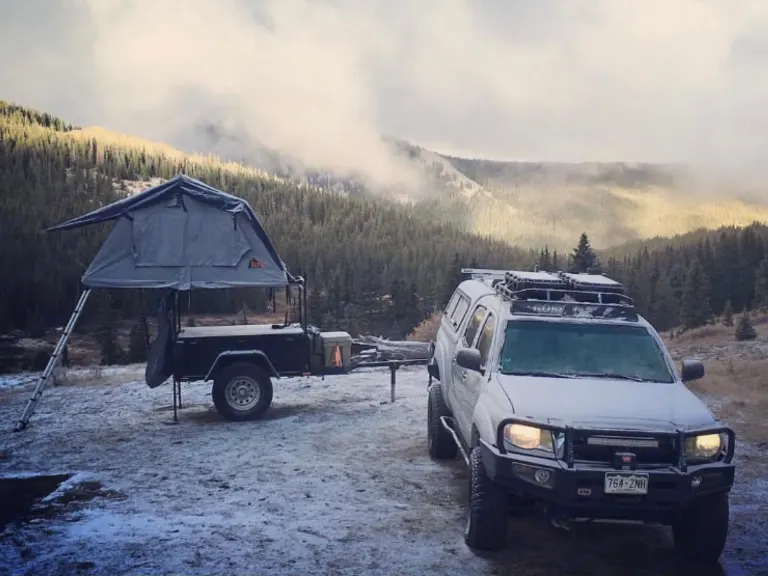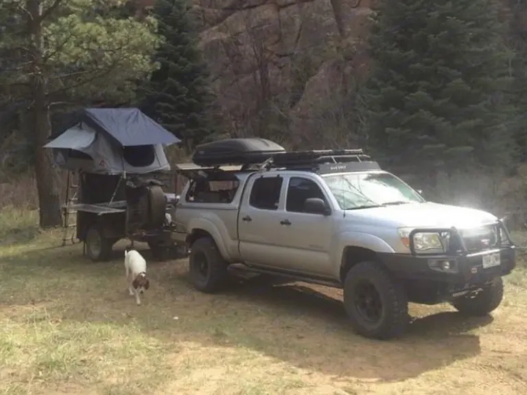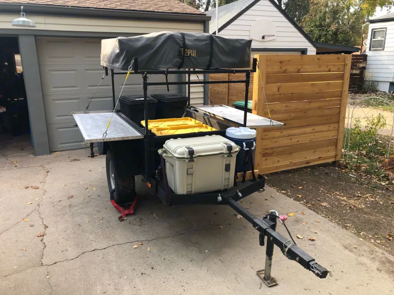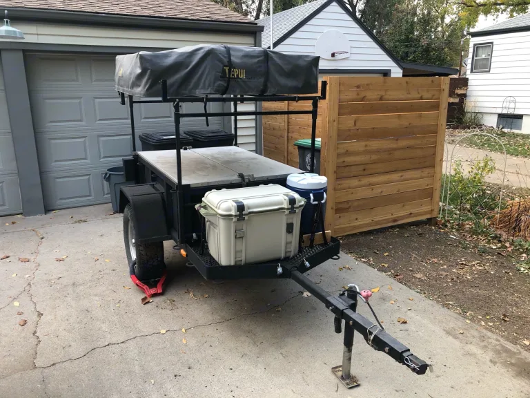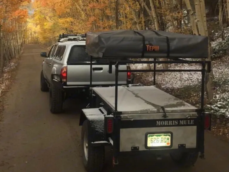 The Morris Mule trailer is an off road capable trailer with a Tepui 2 person tent mounted up top. The rig is light enough to be hauled by almost any vehicle with a 2" hitch. It uses a max coupler hitch which allows for full articulation, which comes in handy on trails. The hitch is 20" from the ground. The trailer tops open up to create 2 large kitchen/work areas. The inside of the trailer allows for extra storage. The weight is around 800lbs.The Tepui Kukenam Sky 3 tent sleeps 2 very comfortably with room for a child or dog. There is a 3” mattress in the tent, just bring your own sleeping bags and pillows. Dogs are allowed as long as they do not scratch and damage the tent.There is a hitch on the rear of the trailer if you want to attach a bike rack.Included camping items:45 quart Otterbox cooler2 Alps folding chairs5 gallon water containerleveling blockscollapsible trash can with trash bagsWhat's included45 quart Otterbox cooler2 ALPS folding chairs5 gallon water containerleveling blockscollapsible trash can with trash bagsRecommendationsGet outside and exploreOther things to noteHave fun