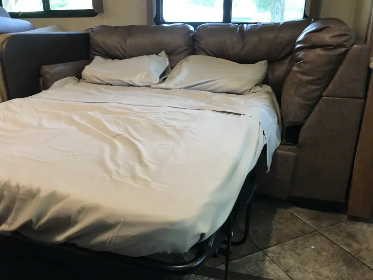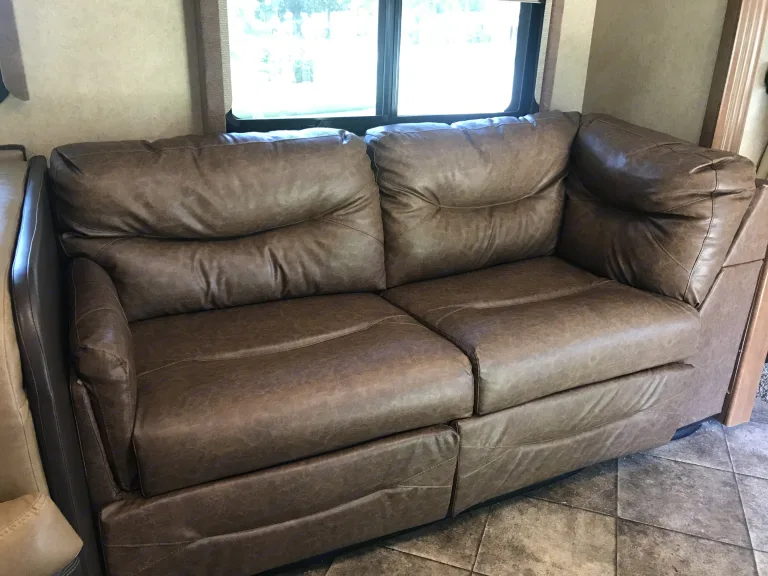 New Front Couch With Full Sized Hide a Bed. New Dinette sleeps 2 children. Fold down bed above driver sleeps 2. Full sized Shower