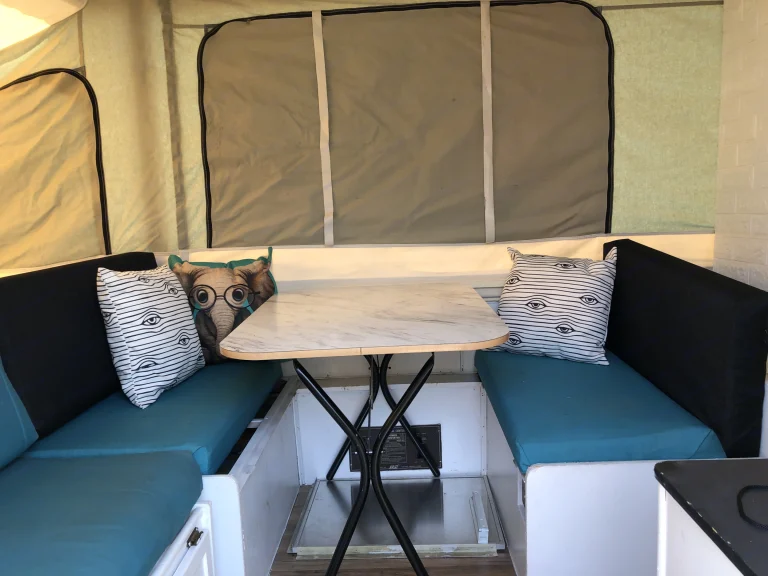 We have this redone pop up tent trailer! Yes we painted it silver! to stand out. Has a bathroom with a stand up shower, the tank is 25 gallons, no grey water tank, you can bring your own pump or when you use the water in the shower is comes out the bottom. For the toilet it goes into a tank and you are responsible for draining it at the end of your trip or a fine is charged. You simply go to the side and pool the tank out. Most camps have a dump. Redone cushions and paints, we offer chairs and camping items as well. This is a perfect pop up for a family for a nice weekend camping. The stove and fridge do not work. Bring your pillows and extra blankets.What's included*Camping chairs