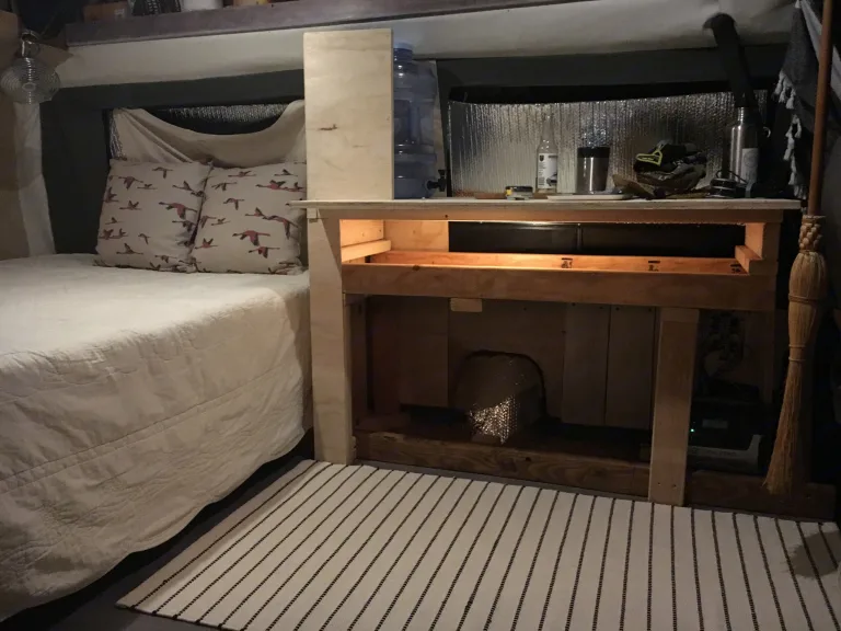 I have gutted the whole van and redesigned it inside with a full size bed and counter, along with redone vinyl wood flooring and a ceiling fan/vent. It’s a lovely home away from home on wheels