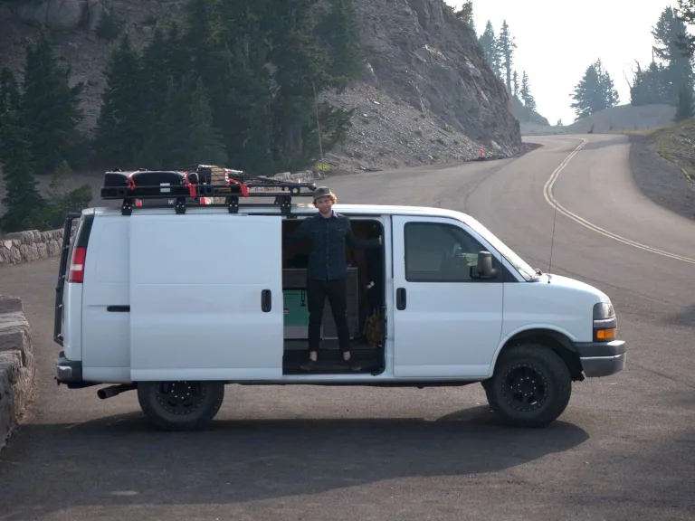 - Unending possibilities for an unforgettable adventure!This van has a powerful V8 engine and is ready to take on mountain roads and a lift kit provides extra clearance. The lack of logos and side windows makes it easy to “stealth” camp at any destination, and the front and back windows are tinted for extra privacy. There are no side windows and the cabin is insulated, so the temperature stays regular throughout the day and night. The bed comfortably sleeps two, but I would not recommend for travelers much taller than 5’8”.There’s no other van out there like it! We built this camper ourselves and are excited to share it with kind, respectful adventurers. We poured a lot of effort and love into building out this rig, so please treat her as if she were your own!