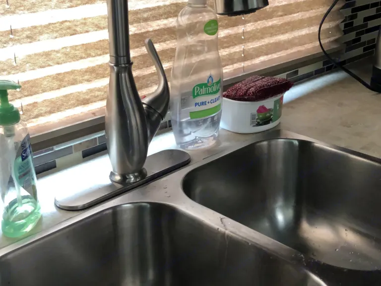 Upgraded kitchen with residantial faucet spray with glass backsplash.