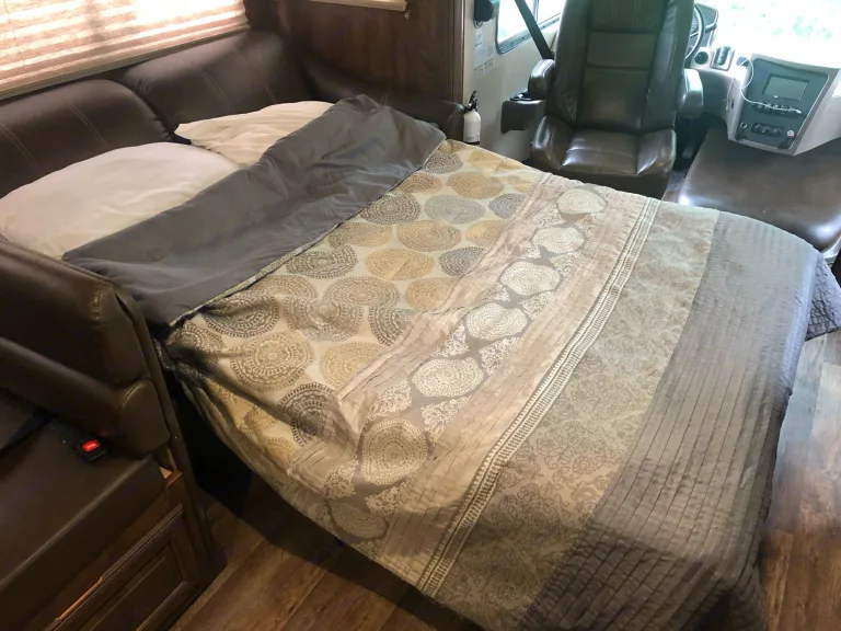 This unit can sleep up to 8 people, Bedroom includes a king size bed with its own AC unit and TV. In the main living area there are 3 sleeping options: Dinette that converts to a bed, Sofa with a folding full size bed and above the cabin drop down bed. One AC unit in the main living area and one flat TV with Roku (you must setup your own acount). If you are camping at a 50A resort feel free to use them both AC units, with a generator you can only use one at time.
