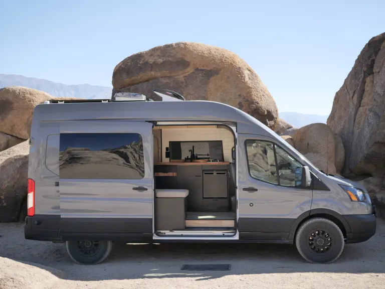 A modern exploration vehicle for whatever lies around the next bend.Disclaimer: This isn't really camping anymore, it's like having a luxury hotel room that happens to be parked wherever you want it to be.Full bed that folds out into larger than Queen (75" x 75")