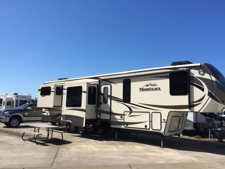 41 feet, 5 slides, roomy, comfy, one-touch hydraulic leveling. Big TV and nice fireplace make the living room/den perfect. Spacious kitchen with huge side by side refrigerator, microwave/convection oven and a center island. King size bed w/ 8 inch memory foam mattress, and a full shower and bath with heated flooring. Tons of storage.