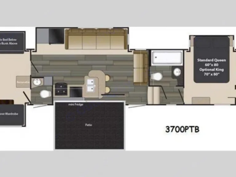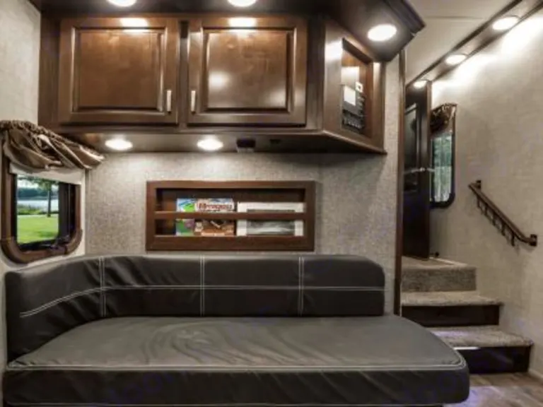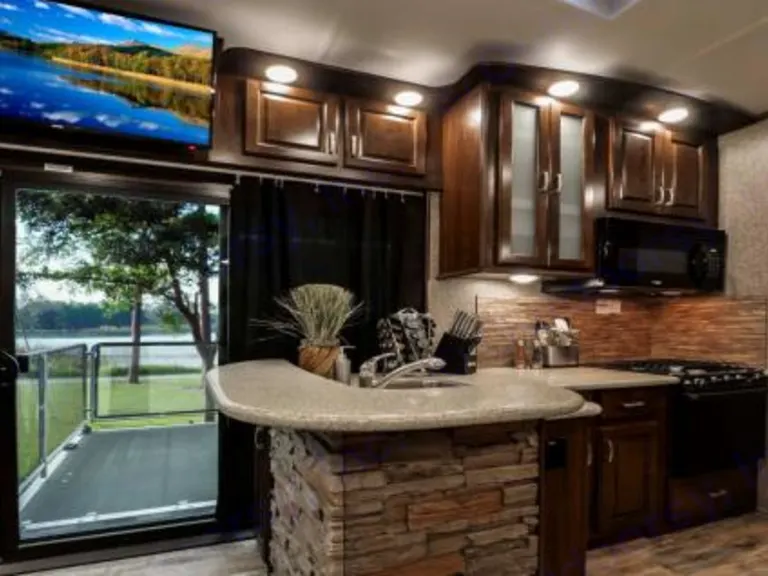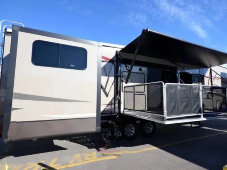 Huge fifth wheel with a bunk house and an outdoor patio. Great for entertaining.