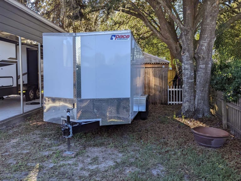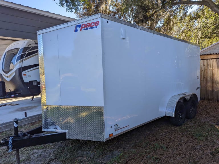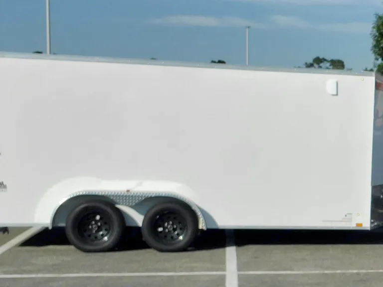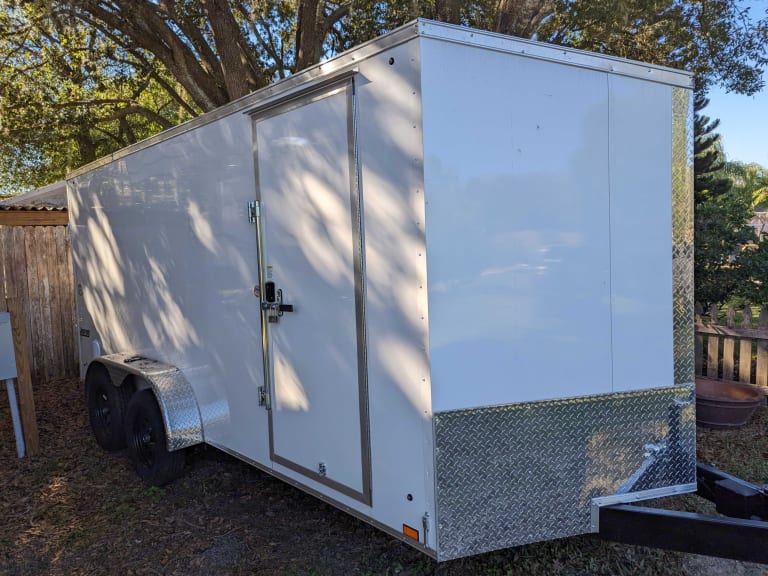 Brand new 7x16 enclosed trailer. Plenty of tie downs. Side entry and large drop down door. Single piece roof, no leaks. Has stabilizing Jack's for keeping it solid when loading or unloading (you can disconnect the hitch) perfect for hauling show bikes/ medium sized move/ golf cart moving. Comes with a full set of locks and a GPS.