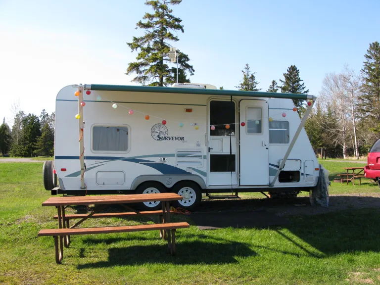Easy to pull with Mid-sized SUV or Truck. It's a hybrid so you only need to fold out the front when needed. Easily sleeps 5 without folding out the front... up to 8 with the front folded out. 2" Hitch included in rental, load level bars and anti-sway bars are included. Easy set up... takes no more than 10 minutes to set up. Has Gas outdoor grill, charcoal grill, Campfire Pit Grill.No Smoking, No Vaping - No Exceptions