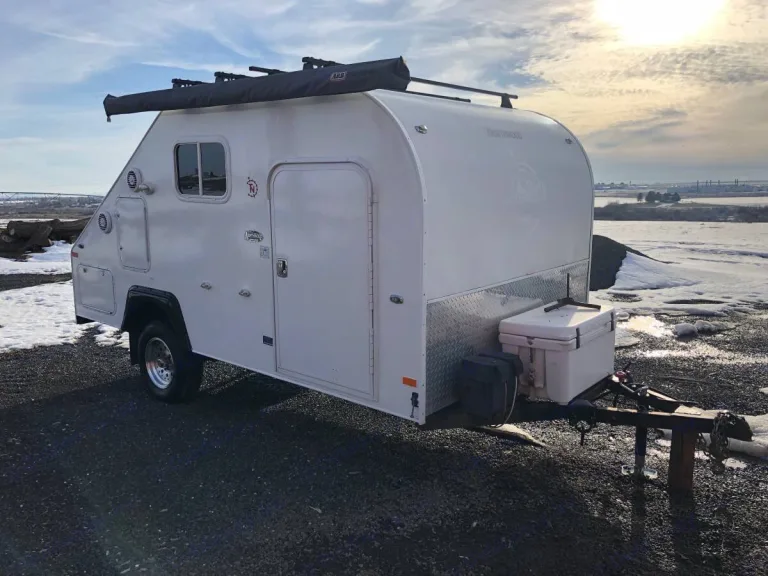 This super cool, lightweight camper is a variation on the teardrop - bigger than a teardrop trailer that will comfortably sleeps two adults, a small child and small dog.A newer bluetooth stereo system with indoor and outdoor speakers. Set up for your weekend away with an attachable outdoor table, large awning, rack and rear kitchen.Cabin floor hooks to tie your equipment down on the road. You can cozy up on the couch or slide it out to make a bed. There are dual doors so equal entry and exit on both sides.Specs: Weight (trailer/tongue): 1785lbs/425lbs (mfg dry) 1920lbs/380lbs (weighed loaded)