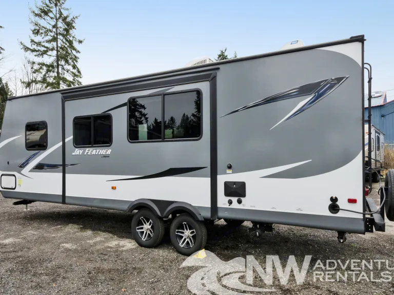 Whether adventuring or relaxing, this travel trailer will perfectly suit your vacation needs. The roomy layout encompasses a huge slide, full kitchen and bathroom, large bunks in the back, and private queen bed up front-sleeps up to 8! For maximum comfort, a propane furnace and air conditioning inhabit the inside, while an outdoor patio awning provides shade from the hot summer sun. Our rentals are always fully stocked with all the living necessities, so that all you have to do is pack your personal belongings and set off on your most memorable vacation yet!This unit has: