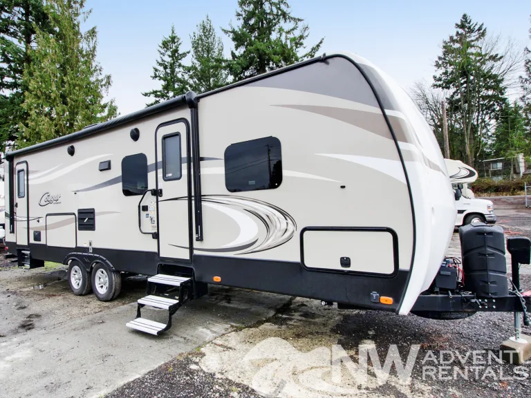 A luxurious, roomy trailer, this rental has a cabin-esque feel to it with its a rustic-glam fit and finish and oodles of wooden storage. With a large electric slide-out, full kitchen and bathroom, private queen bedroom, and sleeping for up to 10, this unit is nothing if not spacious. The propane furnace and air conditioning ensure optimal comfort if you choose to spend time inside putting the entertainment system to use, while an electric patio awning makes for equal comfort outdoors. Don't wait to book your next adventure, summer dates are filling up fast!This unit has: