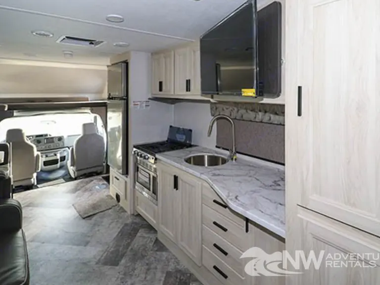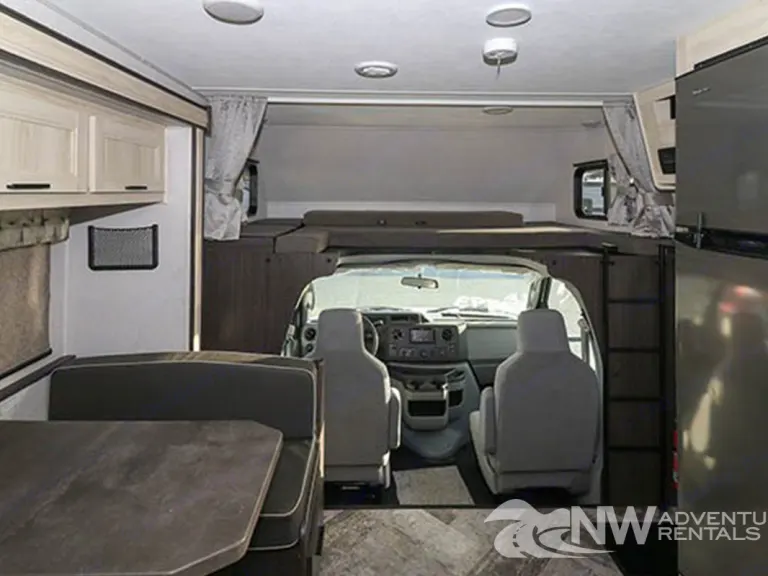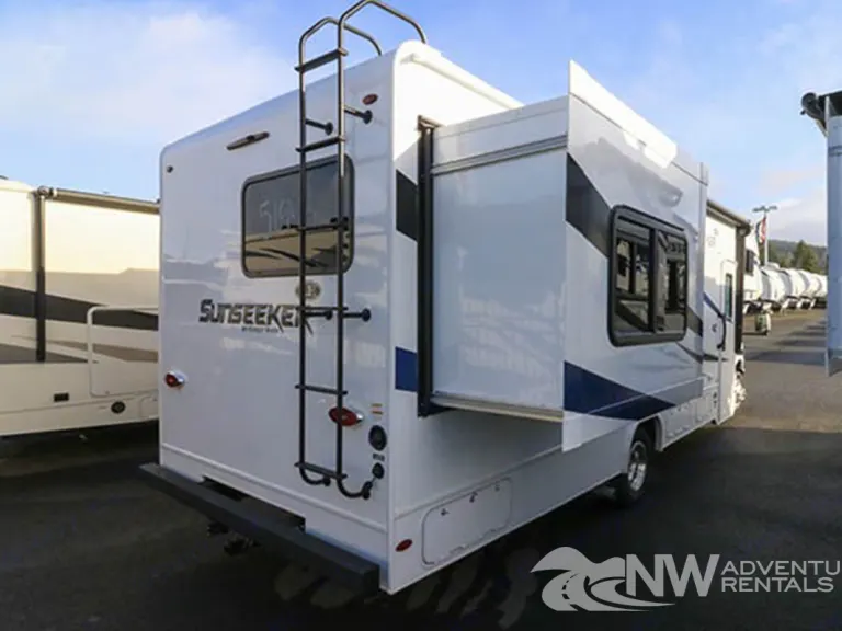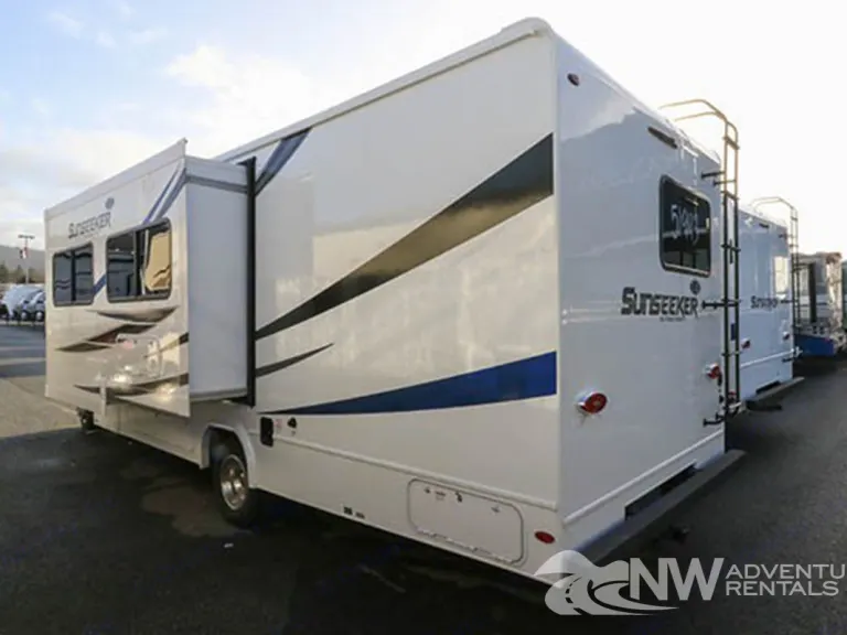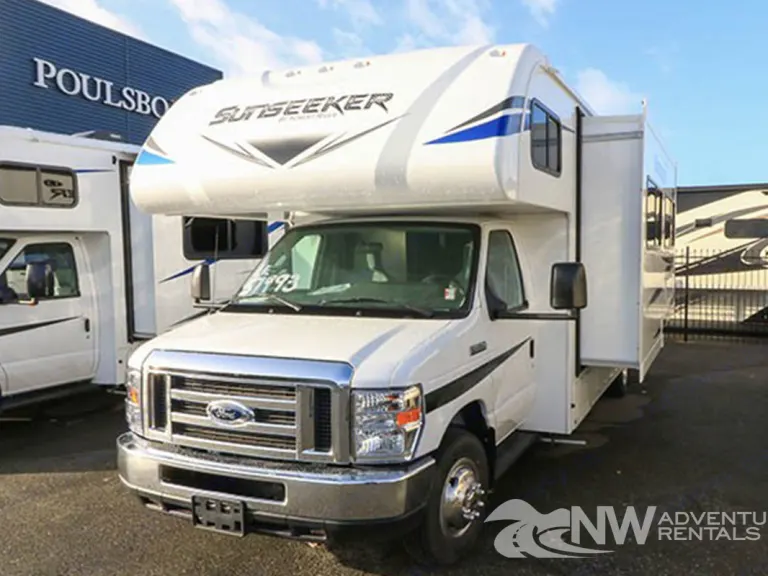 This New 2020 Forest River Sunseeker 2550DSL provided by NW Adventure Rentals has 2 slide outs, a bunk above the cab, Hdtv, a sleeper sofa and a booth dinette. The kitchen has lots of counter space, single bowl under mount sink, a 3 burner stove top, a microwave and 2 door refrigerator. At the rear corner is a full bath with a walk-in shower. The bedroom has a corner queen bed with overhead storage. Heading outside of the Forest River Sunseeker, you will find a power awning, backup camera, roof ladder and lots of storage in compartments.This unit has:
