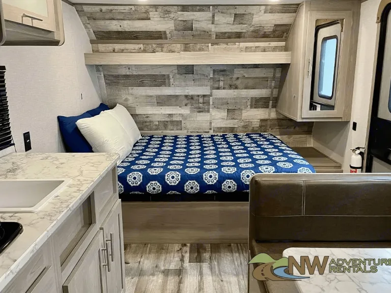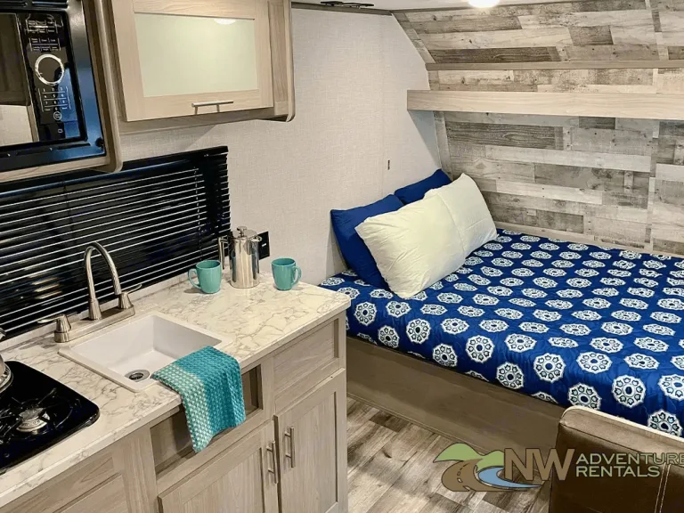 The Dutchman Lantern is a great trailer. Simple but featuring great options like full over full bunks to allow sleeping for larger groups. The Murphy bed allows for more room inside during the day for playing cards or reading your favorite book. This small, lightweight trailer has all the comforts of home with its full bath and fully stocked kitchen. This is the perfect trailer for the family with a light duty half ton pickup. All the great comforts of an RV without having to have a heavy duty tow vehicle.This unit has: