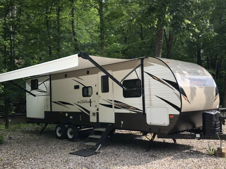 Our travel trailer is so nice with a super slide for the entire living area to slide out. It has vinyl flooring with a touch of carpet. The outdoor kitchen is super awesome. And the bedroom up front has its own door to shut out the rest of the world when you want to.