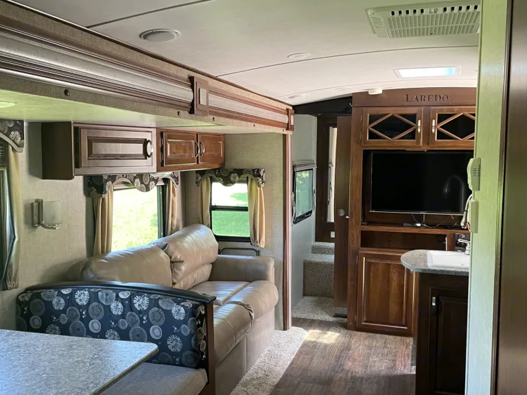 This Keystone Laredo, offers a home feeling comfort with air conditioning , outside kitchen, grill, television, queen bed, 3 bunks for the kids, and much more! This Beauty includes 8 outdoor chairs, coffee maker and the coffee is on us! Linens and pillows are also provided. Silverware , pots and pans, plates and cups are all there! All you have to do is bring the food!