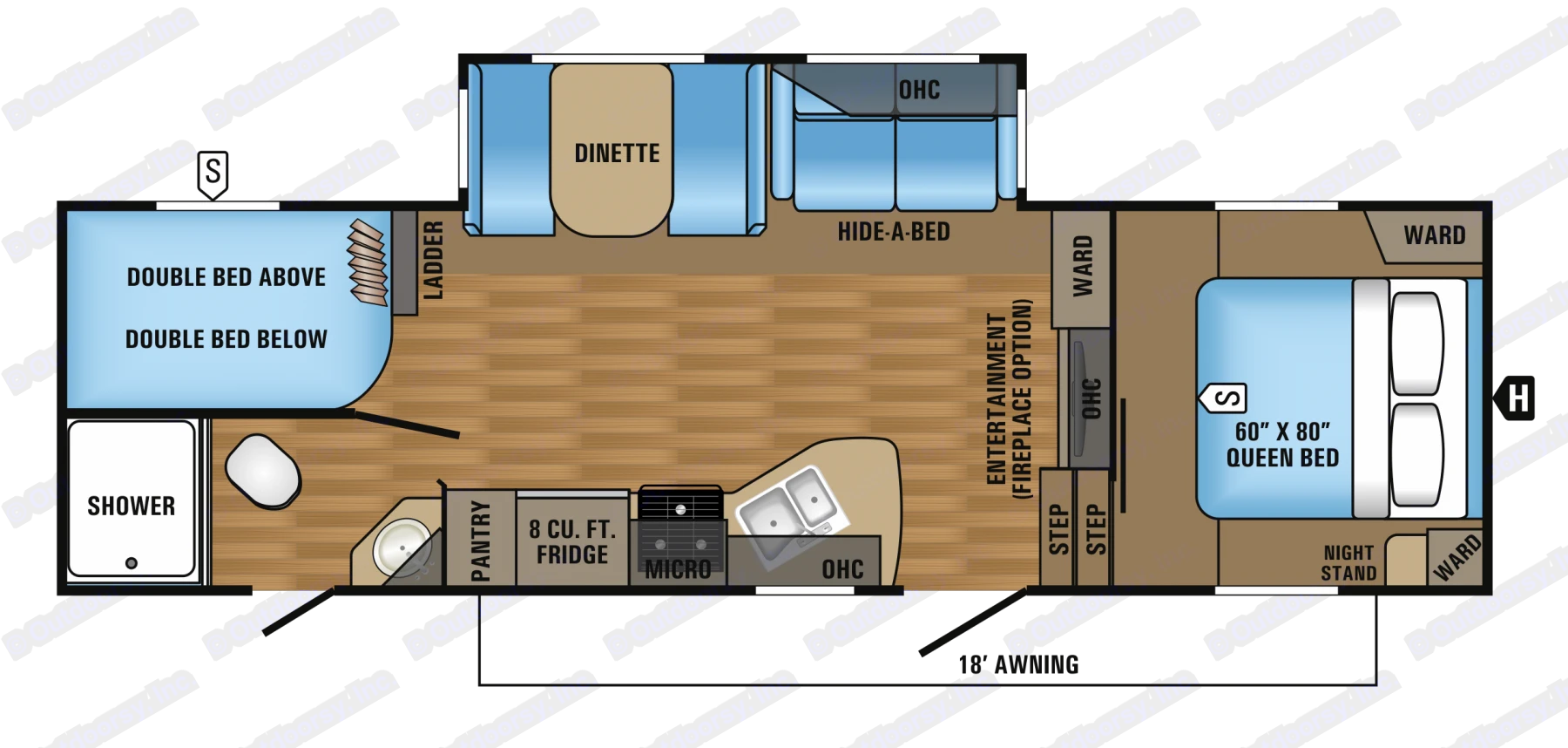 26.5 BHS is a great floorplan with plenty of sleeping room. The full size double bunks along with a fold out couch and dinette sleeper allows up to 8 people to sleep over. It also features a large shower/bathroom. 2 AC units will keep you cool in the heat of the day while the fireplace will keep you toasty at night.
