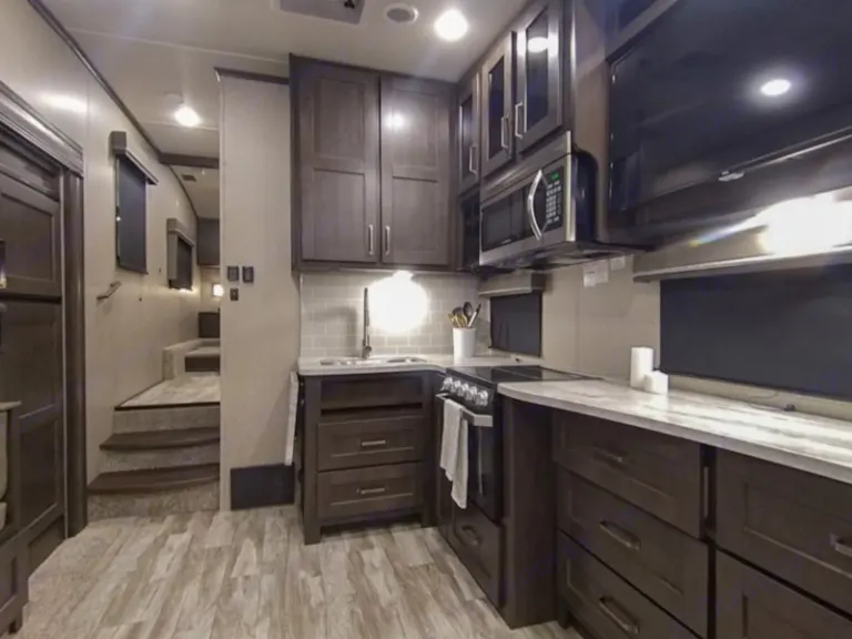 Our camper is both beautiful and functional. Open living concept for the entire family to relax indoor and out. Built in USB ports for charging your devices, motion sensor lights in the entry, bathroom, closet and storage compartments. Rear storage for your coolers and larger items, stock hitch to attach a bike rack etc. Tons of kitchen storage for your dry goods and even a wine rack! 3 burner gas stove with oven and microwave. Fridge runs on both gas and electric. Smart TV with DVD player/Stereo. Tons of easy open windows that allow an abundant amount of natural light and fresh air with easy open/close blinds for privacy. 2 rear full size bunk beds with a queen size bed in the private master. Dinette converts to a bed for additional sleeping area. Theatre seating reclining love seat includes lighted cup holders, under lighting, heated seats that also massage. Smart TV, indoor/outdoor speakers. Includes all 3 available package options, Artic 4 Season Protection, Power Package and Peace of Mind Package. Auto leveling with hitch height memory.For your convenience, our camper includes the following items: Linens for 6, towels for 6, pots/pans, plates, cups, utensils, cutting boards, Keurig coffee pot, crockpot, electric skillet, 2 burner hot plate, propane table top grill, outdoor rug, broom, EZ-up canopy and outdoor table.What's includedFresh linens for 6, pillows for 6, bath towels for 6, Keurig coffee maker, pot/pans, utensils, crockpot, electric skillet, 2 burner portable hot plate for convenient outdoor cooking, portable propane grill, canopy, outdoor rug, outdoor table...RecommendationsEasy to pull light weight camper for both short and long distance trips.