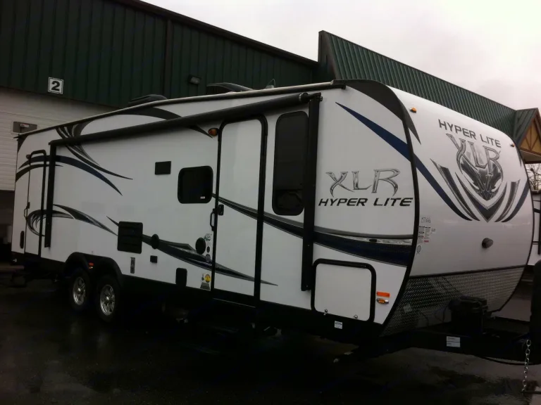 27 foot toy hauler sleeps 6-5 comfortably, has loading ramp with night lights at gate, big awning with led lighting, outside shower or wash station, hot and cold, 2-6 volt batteries and two 20 pound tanks for propane, inside has slide out dinette/also bed, big fridge, stove, microwave,air conditioner, furnace, all digital, double bed up front, retractable double bed in back of garage, easy setup 1/2 tonne truck will pull it, trailer ways 6000 pounds empty