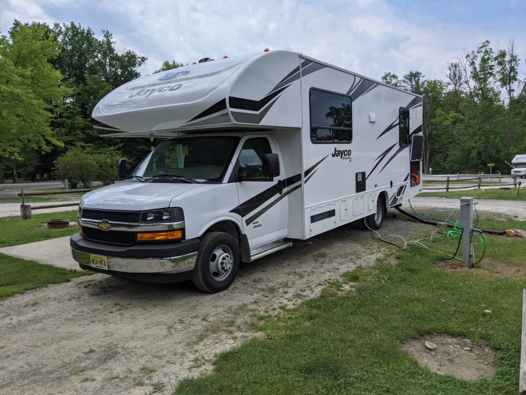 Class C Motorhome, specifically a 2020 Jayco Redhawk SE 27N. Drive with ease and comfort in its automatic transmission with cruise control and a rear view camera. Very large trunk storage area. 8 seats belts, 2 Roku TVs. A Queen bed and a very large loft style queen bed that is bigger than a queen great for multiple children or or 2 adults with room to spare. Inside the RV gives you a Kitchen setup including convection oven microwave combo, dining area (converts to a bed), and a couch (converts to a bed). In the lounge binge watching your favorite shows on our Roku Smart TV with cable hook up. The AM/FM/CD touch screen, with Apple Carplay and Android Auto compatibility, radio also has 2 outdoor speakers for when you want to relax outdoors under the power awning/canopy. Your pets are also very welcome on board. A shower separate from the toilet with its own private door. There is also a door separating the kitchen lounge area from the rear queen bedroom and the restroom area. This RV is self sufficient equipped with a a roof top air conditioner and heater, hot and cold fresh water tank and a generator so you can travel off the grid. Please scroll through the pictures and ask any questions you may have.
