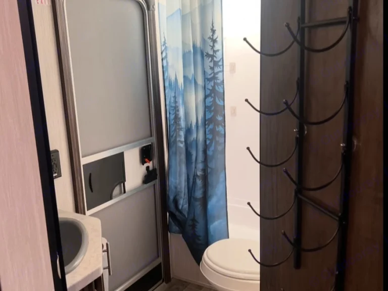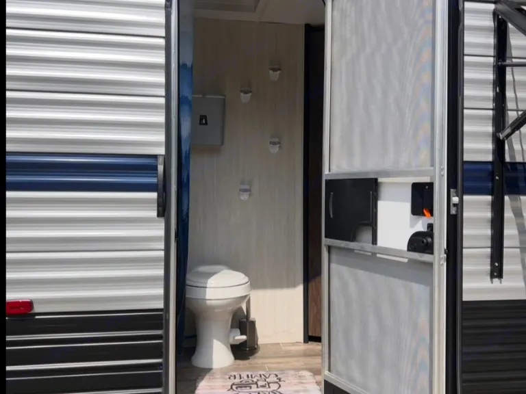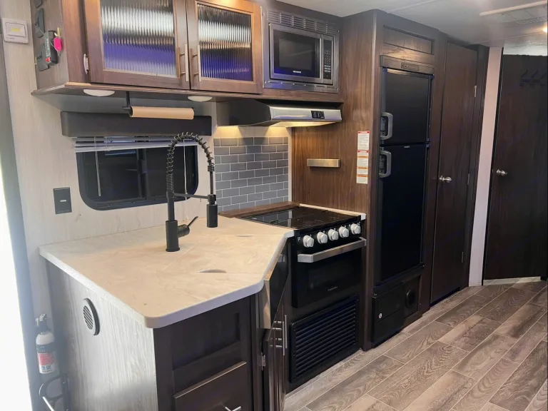 Step outside and enjoy the 16-foot power awning for shade and shelter. The outdoor kitchen is a highlight, equipped with a mini-fridge, a 2-burner griddle, and an ice maker – perfect for campfire meals. An outdoor shower is also available for quick rinses after a day of adventure.