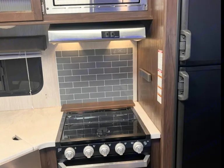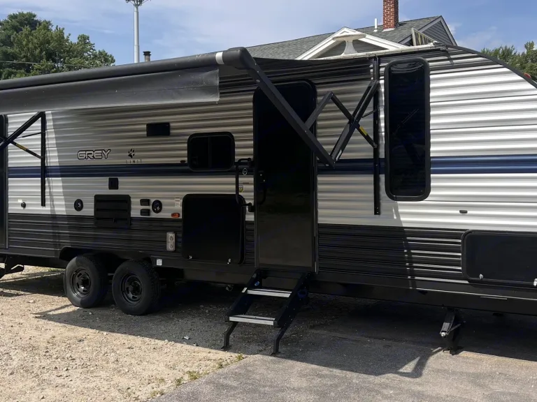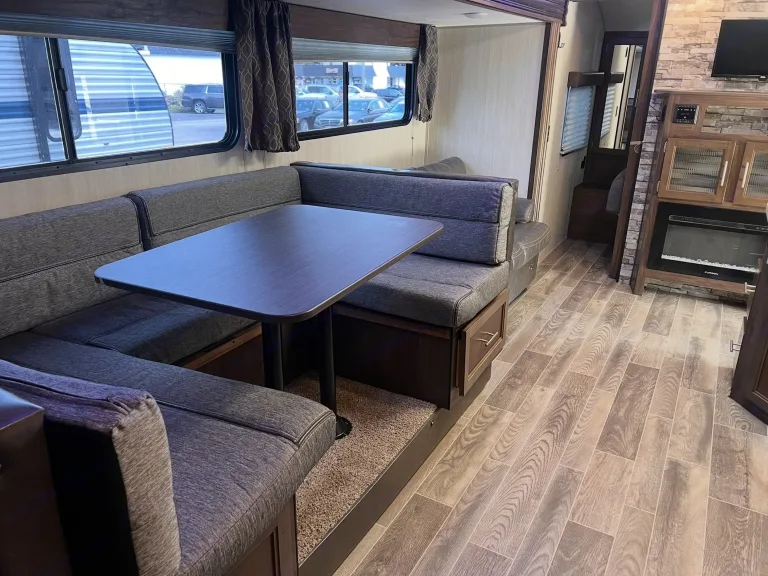 Relax in comfort with a cozy fireplace. The large slide-out, topped with an awning, expands your living space, and dual entry doors offer easy access. You'll find tons of storage throughout, including a convenient front slide-out storage tray. Plus, we've updated the faucets for a touch of modern convenience.