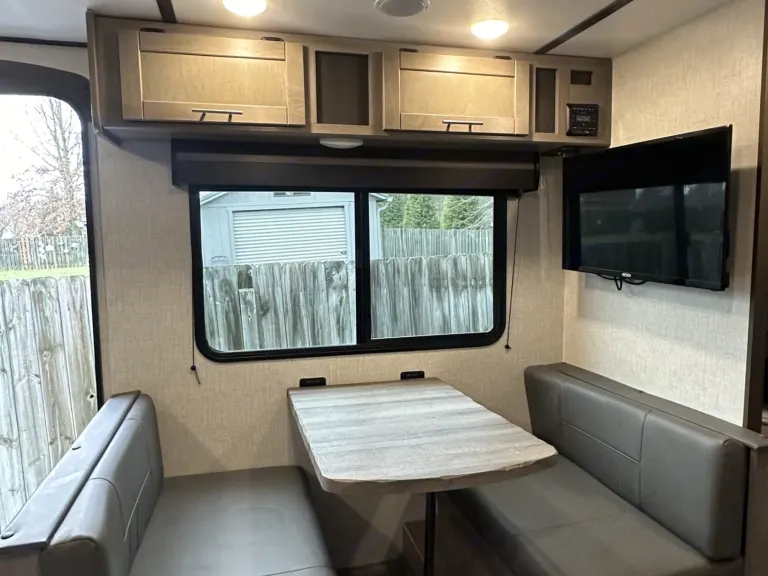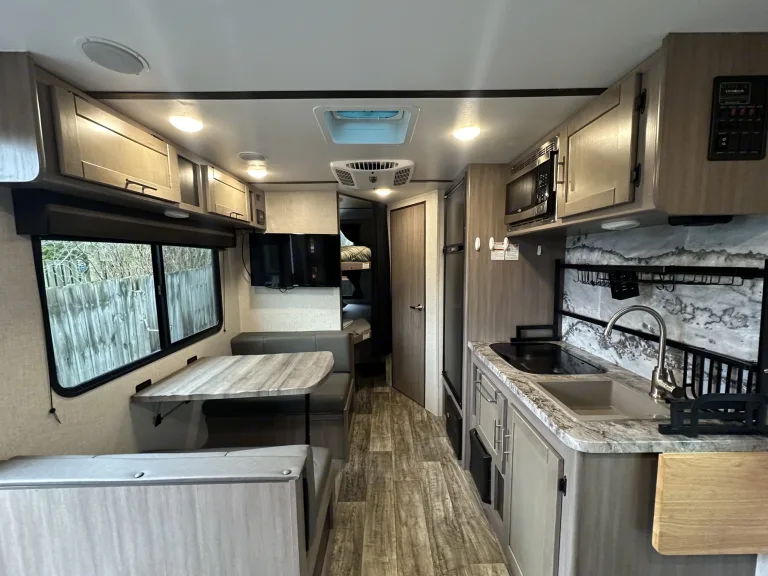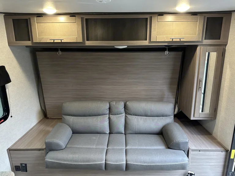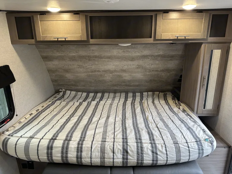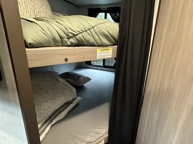 Queen-Size bed awaits you. The couch converts along with the dinette table to beds as well as having bunks in the back for additional sleep space to accommodate up to 7 people.