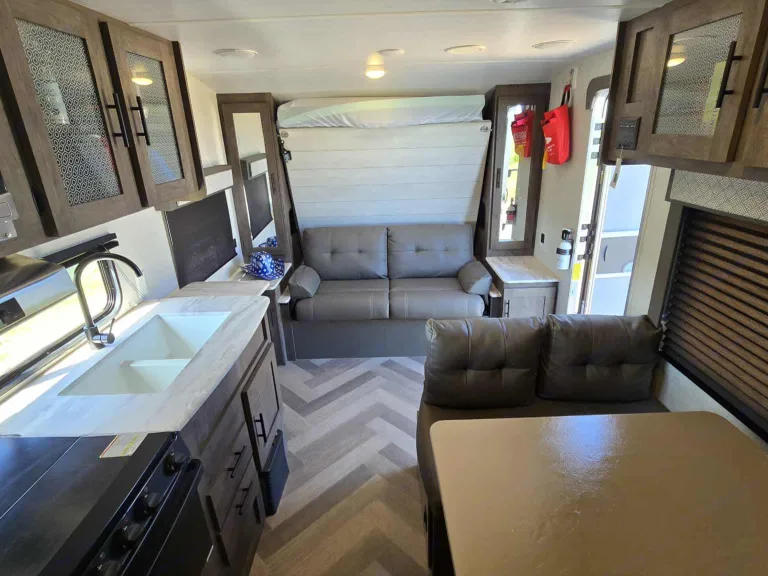 Great little camper that fit just what our family of 4 needed. It has a grill, small outside fridge that all worked great but we didn't need this trip. The 2 bunk beds are great for teens and under. The host was great. Went through set up(which is all powered and simple to use) and explained in detail all you need to know. The A/C works great!!! As does the kitchen fridge. Host provides all kinds of utensils and other items to make for a great trip! Host was easy to contact and answer any questions. This will be our 1st choice for any future trips!