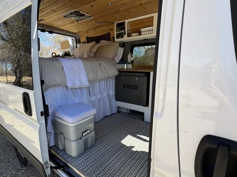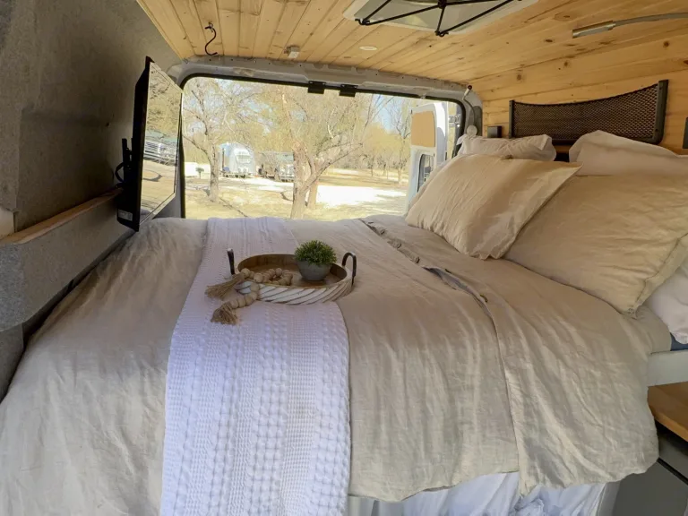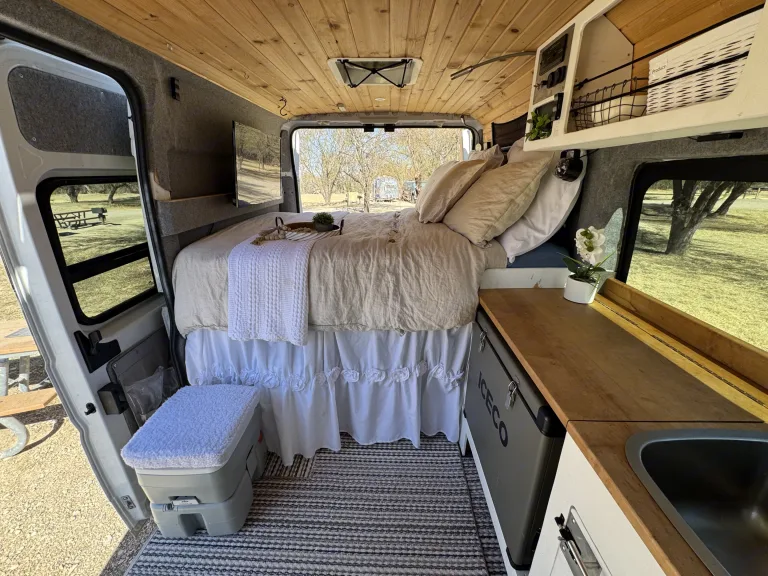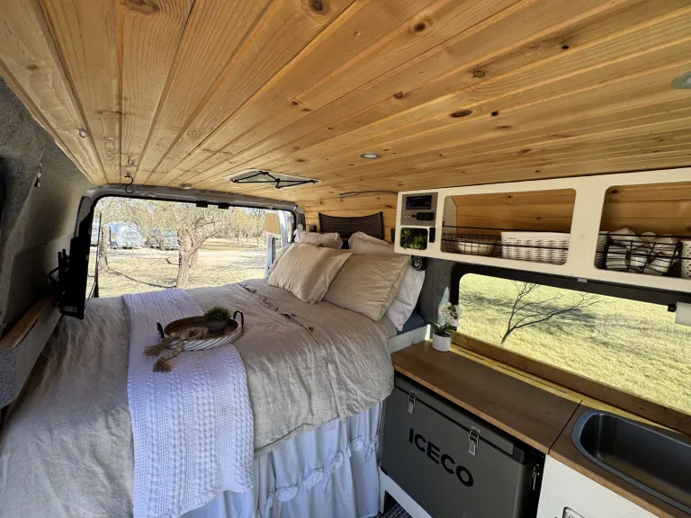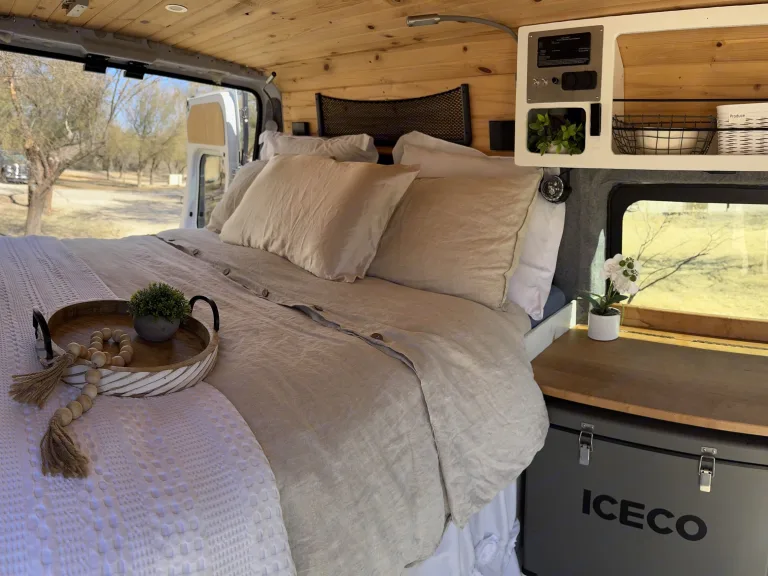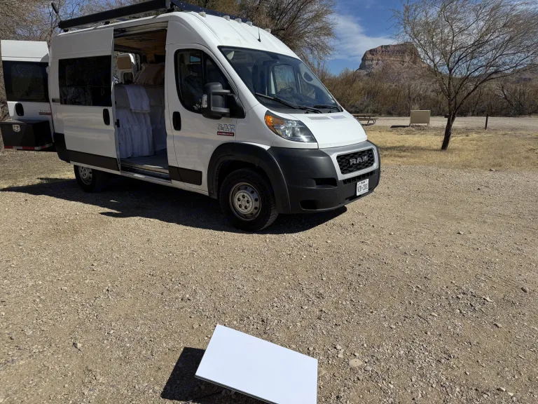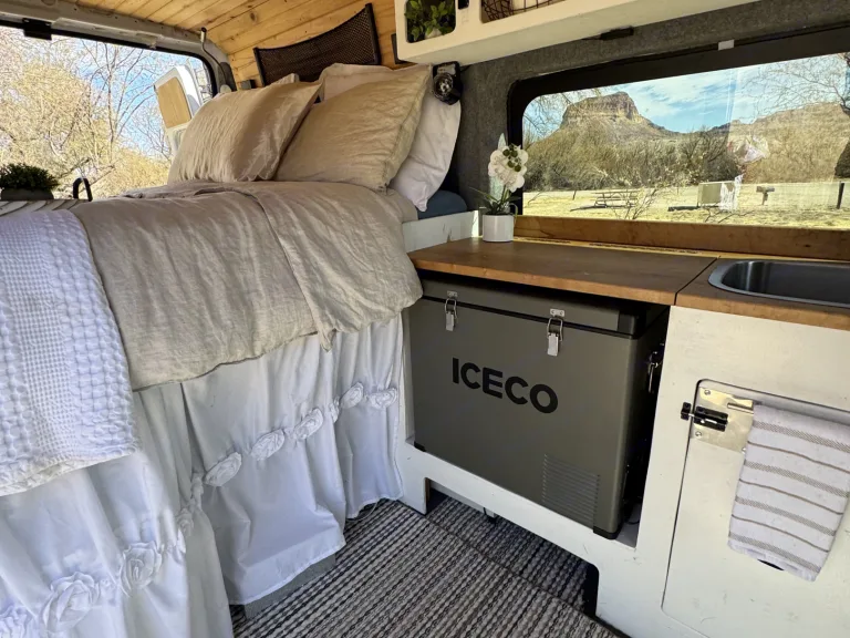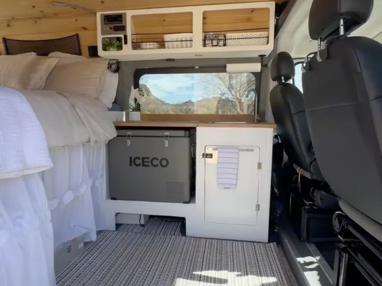 The Freedom Camper Van comes with the basics of a queen bed, sink, refrigerator, AC/fans, Starlink internet, yeti battery charged by solar panels, portable stove and cooking utensils, and shore power hookup. Enjoy roaming wherever you care to go! Can request a variety of add ons including tent, sleeping bags, chairs, and much more (for free!)