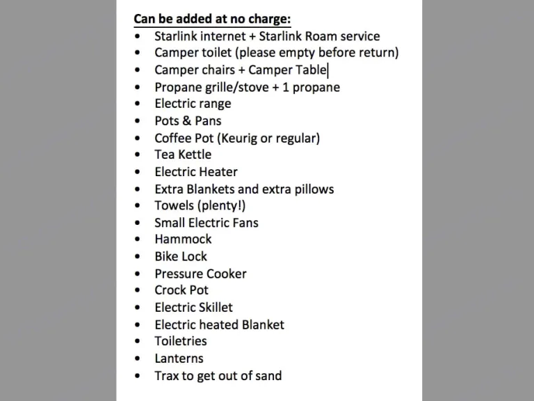 What's included• Can request a variety of add ons including small Honda, gas generator camping tent, sleeping bags, gas or electric cook tops, chairs, portable toilet, hiking poles, pots/pans/dishes, Keurig coffee pot, electric heater, outdoor chairs, extra blow up mattress, extra pillows/bedding, mountain bike, blankets and more! [some may be subject to availability]. Pets welcome at no extra charge!Other things to noteThe battery solar power doesn't provide much more than powering the fridge and lights all day. For AC or extensive heater, you either need shore power or generator power (generator provided for free). I own an Airbnb business so likely have most add-on items you may need! Feel free to ask if you need something for your adventure! Flexible with drop-off/pickup and if you need to leave your car on my property while traveling, that can be arranged too!