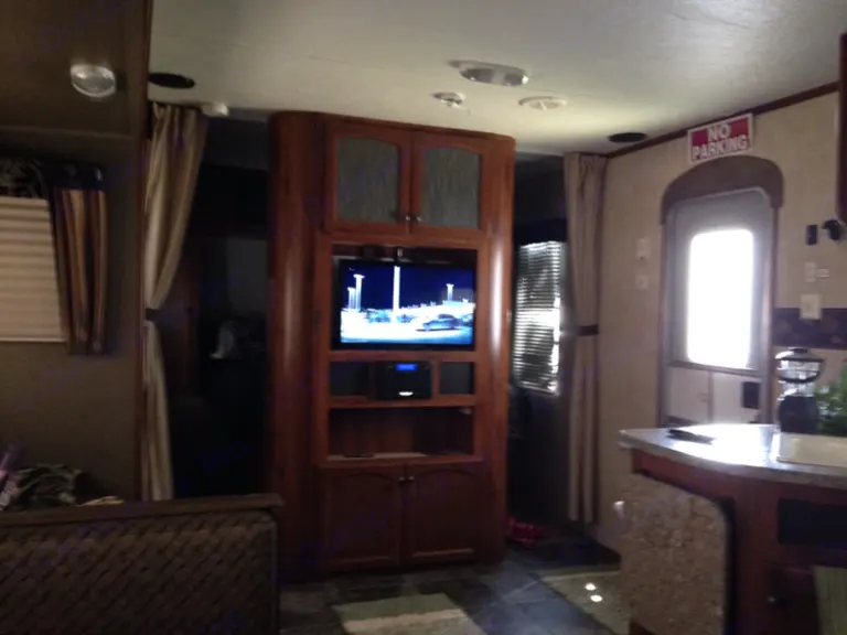 Queen front bedroom, full living room dinette slideout. Rear bunk bed sleeping 2. Dinette folds to sleep 2, loveseat folds to sleep 1. Power awning.