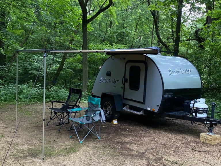 If you’re an avid tent camper but tired of the uncertainty weather can bring, our camper is the perfect fit for your next getaway! Our teardrop camper is fitted with a furnace, air conditioner, and three speed fan to keep you comfortable no matter the weather. It also features an outdoor kitchen and a large awning. Although it doesn’t look very big, there is a lot more room than you would expect. I am 6’1” and honestly, I was skeptical about sleeping space before we bought it. Much to my surprise, the bed was a lot longer than it first appeared! If you have any questions about our rig we would be more than happy to answer them!What's includedFresh linens, awning, full propane tank, fully charged battery, full water tank, 12V Coleman Cooler.Other things to noteThis weighs 1320 lbs dry. We easily pull it with our 4 cylinder Subaru Outback. You will need a 7 pin trailer plug for it.