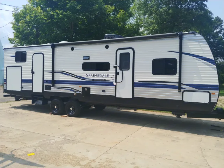 I will not rent the rig to those who want to haul it somewhere. Looking to stay within 50 miles but will go further for a larger delivery fee.This is a 2021 Keystone Springdale with a beautiful modern interior. For sleeping arrangements it is equipped with a twin size bunkbed, a single twin size bunk with queen pull out underneath, a full size pull out couch, and a queen size bed in the Master bedroom. This rig is also equipped with a bathroom with shower that is easily accessible from inside and a direct access from the outside as well. On the exterior this rig features a nice outdoor kitchen that has a sink, mini refrigerator, and small cook top. What's includedCooking utensils, pots/pans, coffee maker, bed linens, rags/towels, extra outdoor propane grill, outdoor mat, camp chairs, cleaning materials are available in the camper for use.Other things to noteNo Smoking