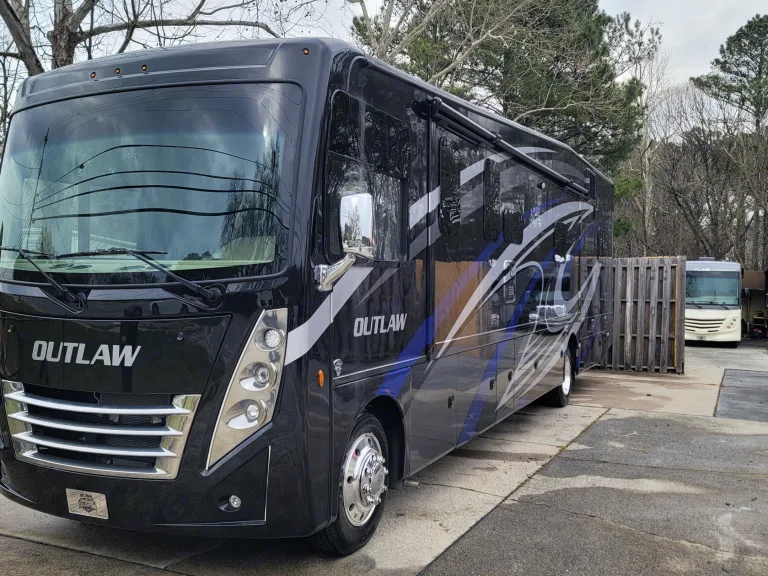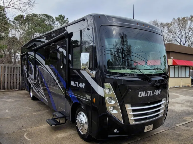 When you take a trip in this Outlaw Class A gas motorhome toy hauler, you are taking a trip in an RV that breaks all of the rules of traditional motorhomes. With four LED TVs, this unit gives you the ability to stay modern even while living in the great outdoors, yet the skylight over the shower in the bathroom gives you the chance to bring in a little bit of that outdoor sunshine to brighten up the space. And no longer do you have to leave part of your family at home while you travel because this unit can sleep eight people comfortably anytime needed. Even the residential refrigerator adds extra space where you need it most so that you can store fresh dairy and leftovers without the risk of them spoiling. You will also love having the two entry doors to give you a smooth flow of traffic in and out of this unit throughout your trip!Thor Motor Coach has designed the Outlaw Class A gas motorhome toy hauler to be able to accommodate all of your storage needs with amenities like the lighted rotocast storage compartments and a basement pass-through storage. The large, separate garage allows you to tow along all of your outdoor accessories, such as bicycles, kayaks, and ATVs without having to maneuver around them while you live your life in the main coach area. You will appreciate the garage drop-down Zero-G ramp door and snap in patio system for all your outdoor activities, plus there is an exterior 39" LED TV to watch the big game. Inside, you'll find residential vinyl flooring, a solid surface kitchen countertop, a bedspread and pillows shams to make you feel right at home, plus many more comforts.