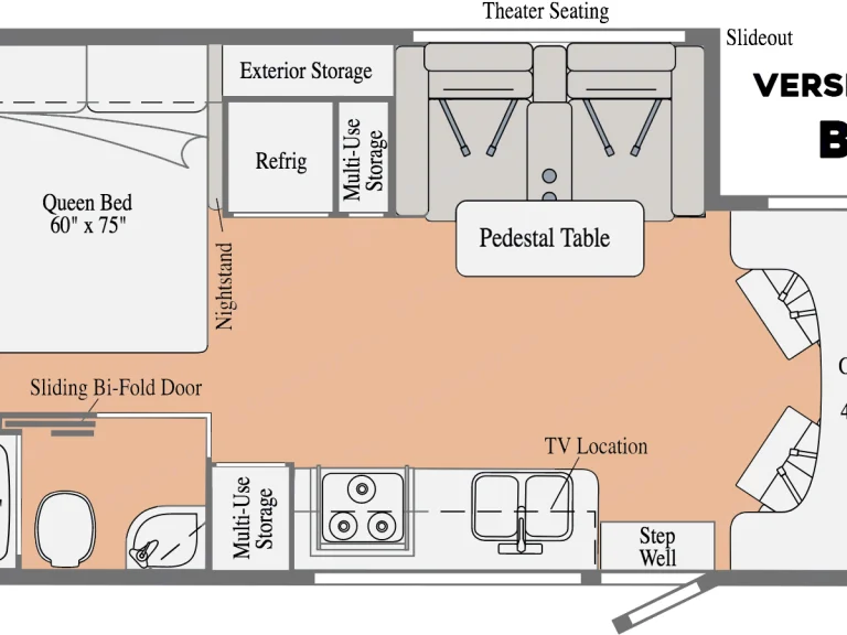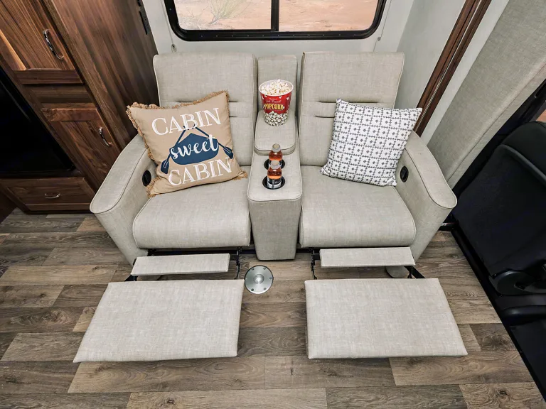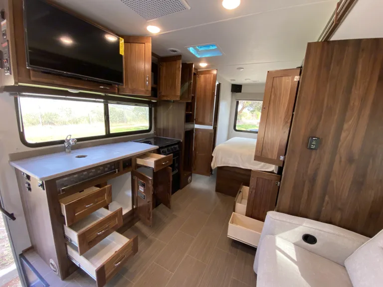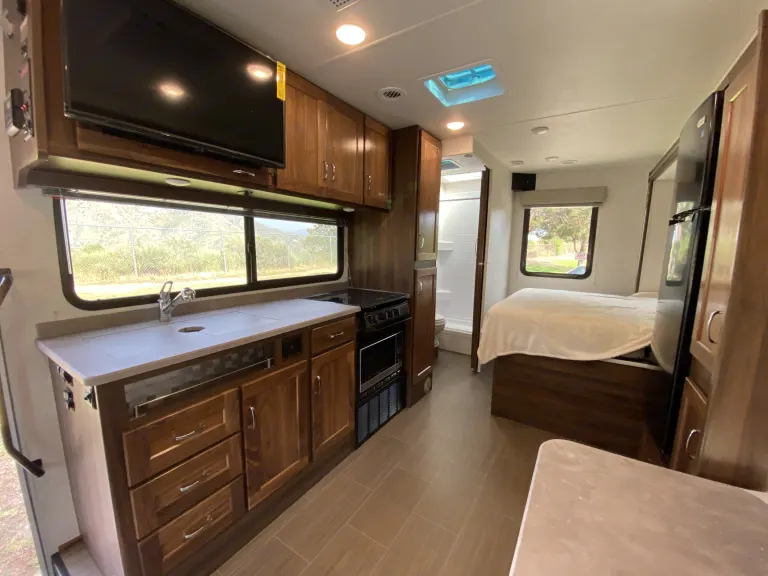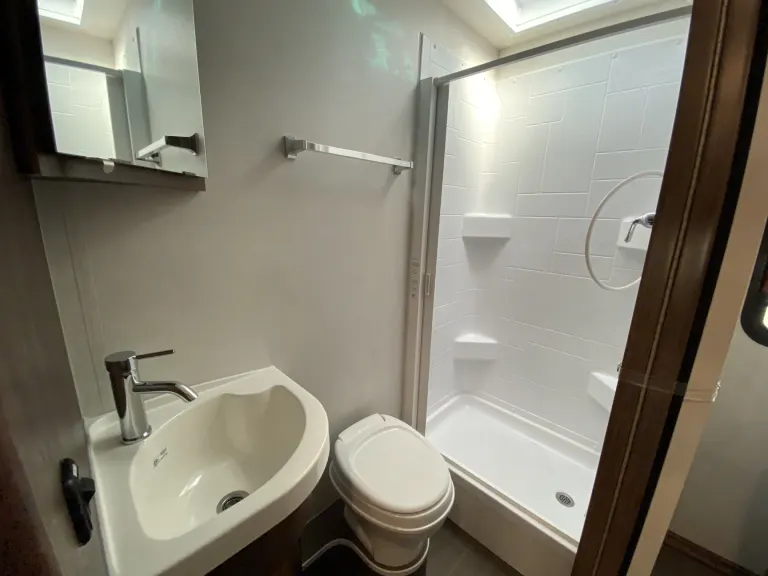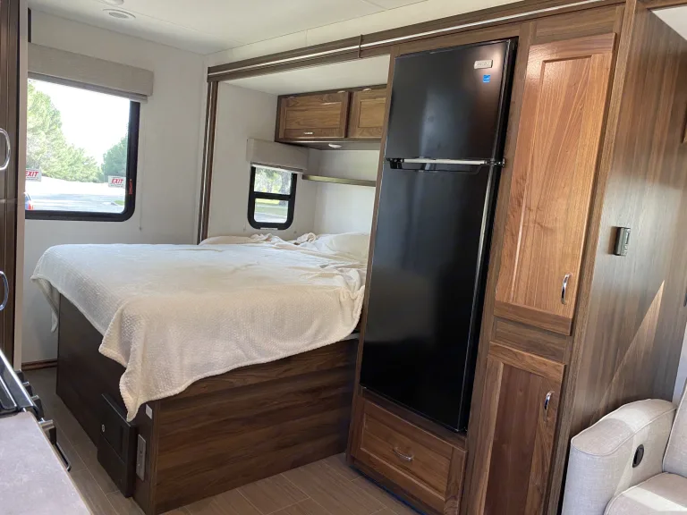 This floorplan has two beds. The main bed is located at the rear of the vehicle and is a true queen size. There are night stands on either side of the bed and the best part is that it’s a walkaround bed, meaning you don’t need to climb over your partner to get in or out.The second bed is the queen-sized bunk bed above the drivers and passenger seats. There is an attachable ladder that lets you climb up to the bunk, and naturally, this is the first place the kids will want to check out.The living room has two recliner chairs perfect for lounging and enjoying movie night. The chairs have seat belts which makes it 4 seat belts in total.We have multiple models on our fleet, but the Model Ps feature the most spacious bathrooms out of all of our floorplans, and the biggest refrigerators as well, 7.3 cu ft to be exact. This fridge is big enough to pack food for the whole family and then store the leftovers in the freezer.Of course, there is a TV and a DVD player for movie night. We even include a handful of DVDs for you to enjoy.