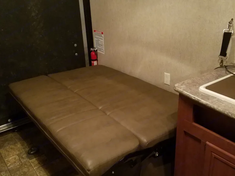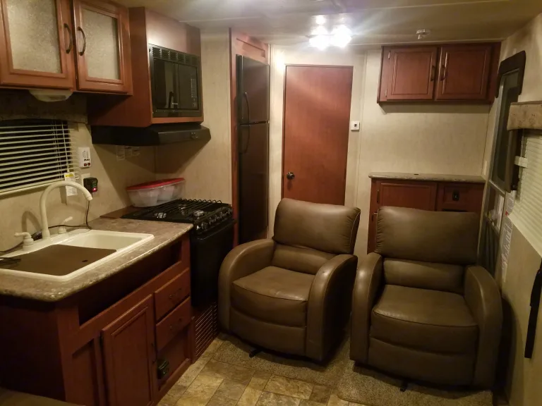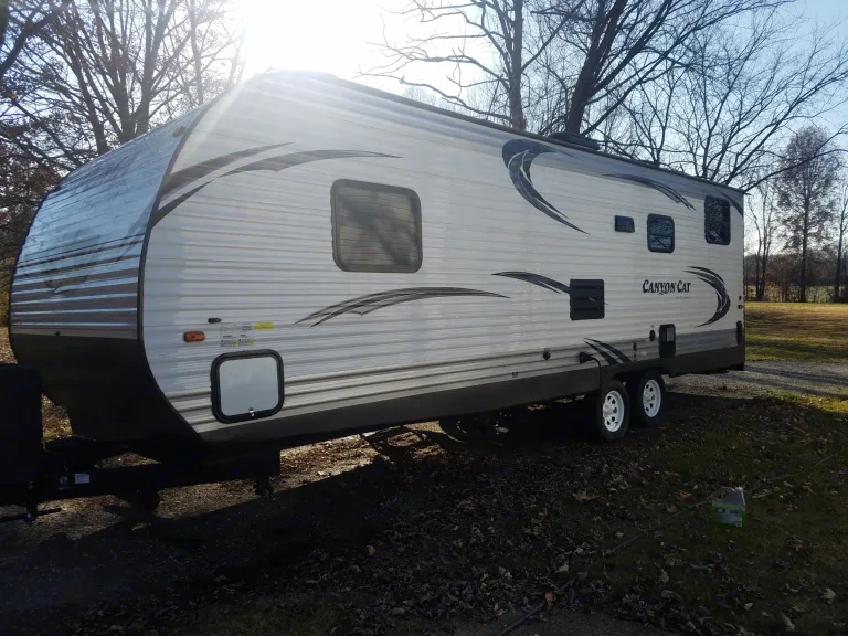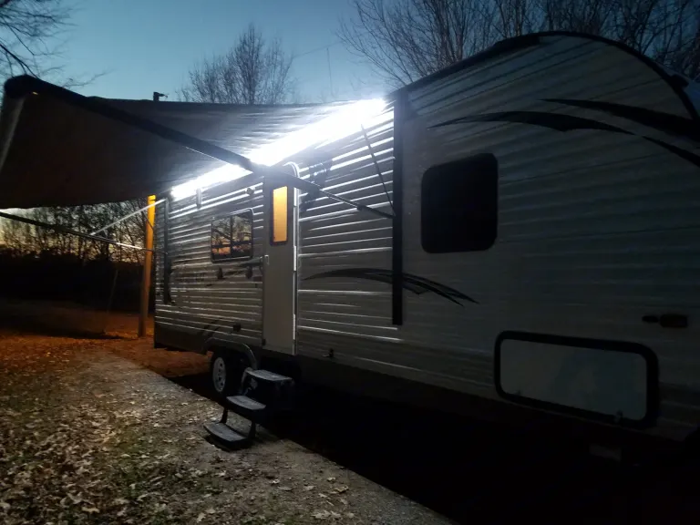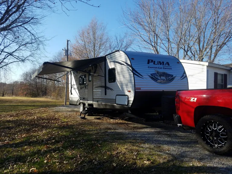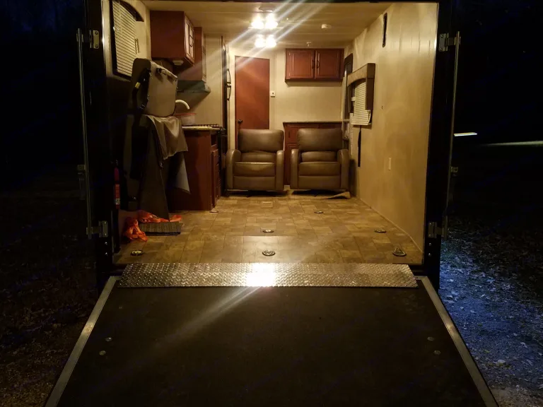 Great camper. Can haul your four wheeler or a rzr of a width of 65 inches. Electric jack and awning. Led outside lighting. Stove , fridge, and microwave. Stand up corner shower and big bathroom. Queen size bed up front with cabinets. Hd antenna and 2 spots for tv's. Inside and outside speakers for the radio, radio is also a dvd player. Kitchen table. With one let down couch That makes a bed that could sleep up to 2. Will pull great behind a half ton. Weights 5300 pounds empty.