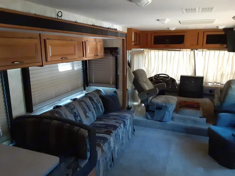 36 Foot Class A RV FOR Rent 12 foot slide out 35 inch tv with satellite sleeps 6 comfortably all dishes and pots and pan for cooking and utensils queen size bed in rear of couch dinette turns into bed and couch has a hide a bed big fridge separate freezer generator 2 ducted AC units full bathroom self leveling jacks ,,,,,very comfortable