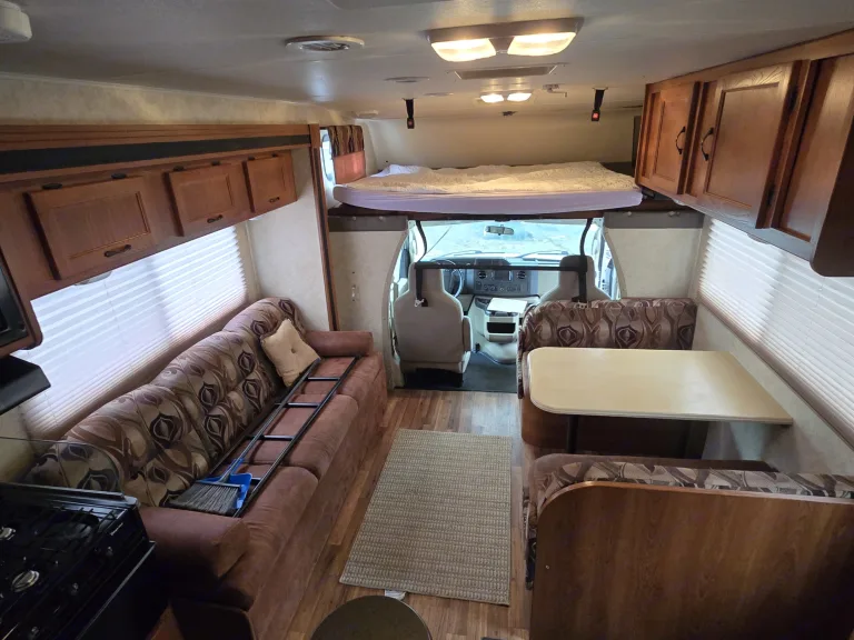 Built on the sturdy Ford E-450 chassis with a powerful 6.8L V10 gas engine (305 HP), it cruises smoothly on highways and handles mountain roads with ease. At just over 32 feet long with two slide-outs, it feels surprisingly open and home-like inside.