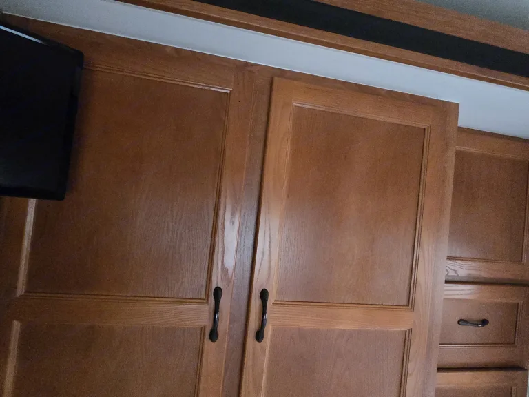 Private rear queen bedroom with nightstands, wardrobe/dresser slide, and a solid privacy door for quiet retreats.