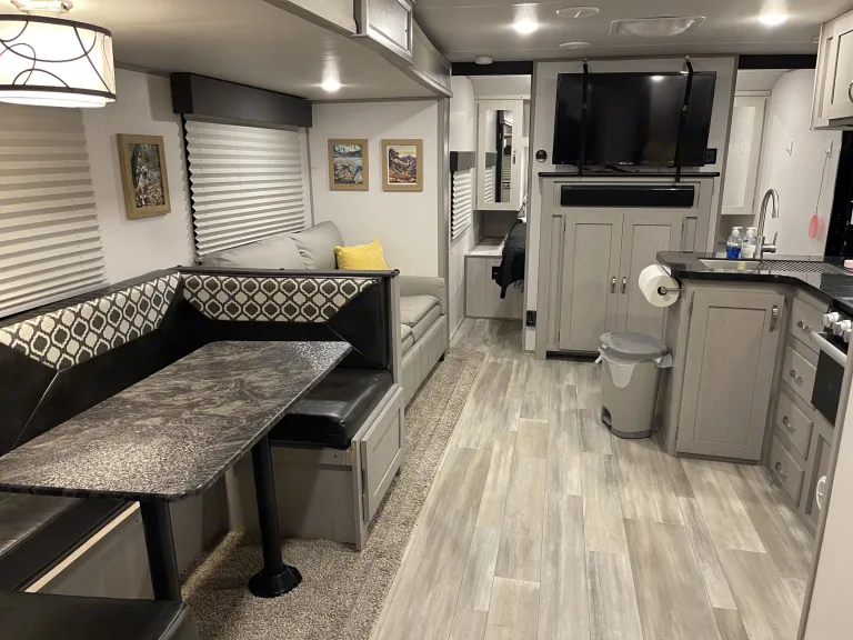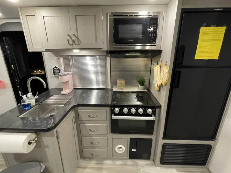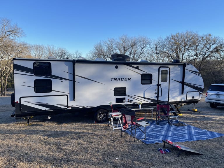 Black Water: 30 GallonDelivery/setup available within 75 miles of McKinney, TX- fees will apply. $300 minimumCamper should be reasonably clean, trash removed, dishes cleaned upon return.Black/gray tanks must be emptied by renter. If not, a fee can be paid in advance or will be taken out of deposit.Video tour: https://youtu.be/hLL8tnosEGEWhat's includedExtras include bed linens, pillows, and towels, basic cooking/kitchen items, Keurig coffee maker, hooks for storage, board/card games, paper goods starter kit. See pictures for exactly what's included!For a $25 outdoor camping fun fee, we will provide 4 camping chairs, 2 outdoor tables, outdoor Edison string lights, and corn hole/bean bag toss game!