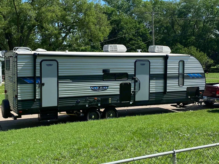 Want a family friendly camper that sleeps 8? Well, look no further. This camper is perfect for the family. Has bunk beds, huge lounge area to eat and relax during the day and for extra kiddos to sleep at night.This camper has two doors: one that goes into main living area and the other that goes into the bathroom. Why is that important you ask? Great question! Well, when you camp it’s great to be outdoors hanging out around the campfire. You have the AC kicking to keep the camper cool. You have a door to the bathroom that you can easily get to and not worry about the cool air escaping. Plus, it helps keep the bugs out.Talking AC...this camper comes with 2 of them!!! The main one is an upgraded version which puts out some nice cool air. The other one is in the master bedroom and it’ll freeze you out (so keep those toes under the covers!)If you’re renting during the cool months, don’t worry this camper has you covered. Along with 2 propane tanks to keep you warm, it has an electric fire place that puts out the heat.This camper also has an outdoor kitchen area. If you are wanting to bring out your inner hibachi, this camper has a nice griddle (Pro Tip: Just cook your rice before you come.) It also makes some nice pancakes. There is also a mini fridge as well so you can stock up on the drinks and not worry about going in and out to get a refreshing Dr. Pepper.Camper comes stocked with cooking supplies (pots, pans, etc). Also has utensils and few bowls and plates. (Pro Tip: Washing stuff as you go saves a headache later.)So what are you waiting for? Grab your truck or ask about delivery and enjoy the lake!*No pets inside allowed! - $200 cleaning fee will be added.*What's includedCooking supplies, campfire sticks for s’mores or hot dogs, pots and pans, cleaning supplies, and an opportunity for a great time!Other things to noteNO SMOKING ALLOWED! Smoking is an automatic loss of deposit, plus possible insurance claim for detailing the camper by a profession.*No pets inside allowed! - $200 cleaning fee will be added.*