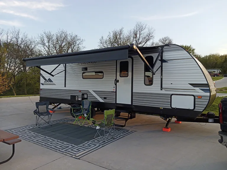Immaculate 2021 Dutchmen Colorado 26BHC with modern farmhouse interior. This trailer is half-ton towable with the included weight distribution hitch, so your Silverado 1500 or Ford F-150 is all you need for a wonderful camping experience!This 30-amp trailer has ducted A/C and a 12-volt electric only refrigerator, and a furnace. An electric fireplace can provide heat and/or simulated flame for a cozy ambiance or nightlight! The power tongue jack and front and rear power stabilizers mean easy setup and teardown, and the powered awning has built-in lighting controlled from the master panel. This trailer also has Outdoor/Indoor Bluetooth speakers, which can be turned on just inside, just outside, or both!What's includedHalf-ton towable!