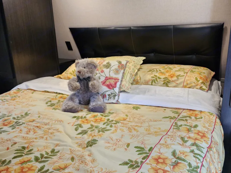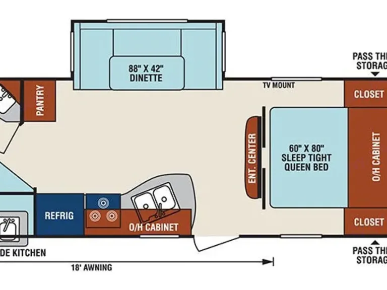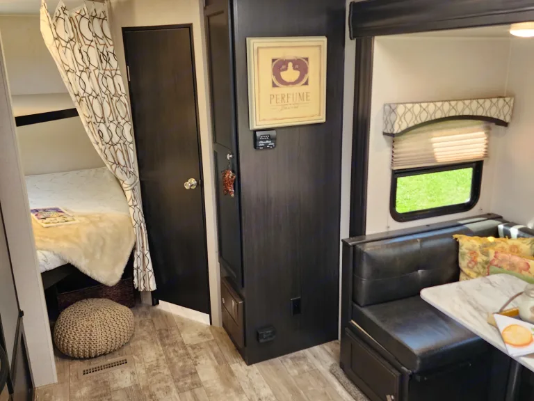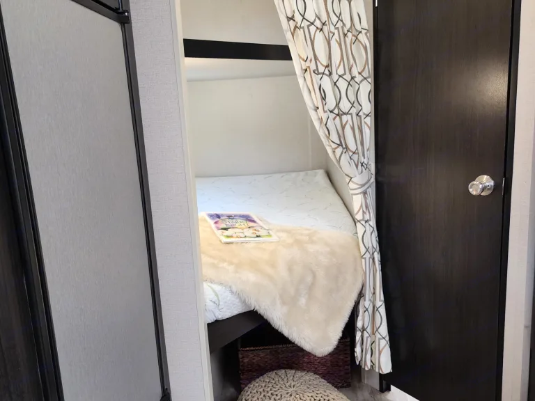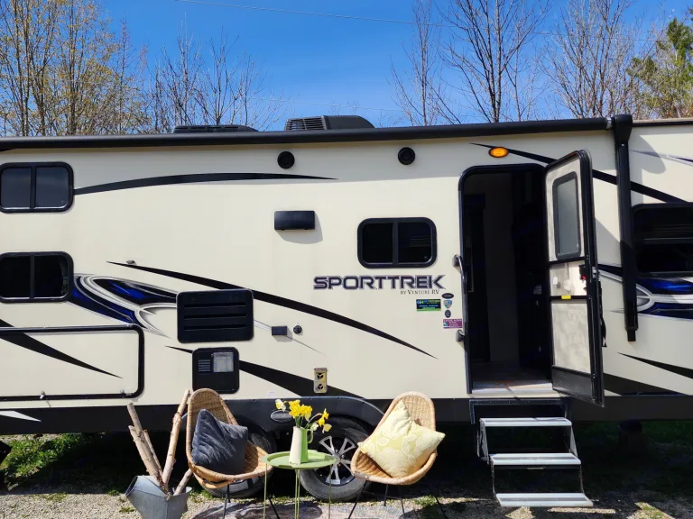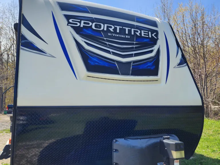 The Sporttrek by Venture which is 28ft long from bumper to tongue, is a delight there is lots of storage space and comfortable contemporary décor to make your trip a relaxing one.With large bunkbeds and a queen bed in its own private room with privacy doors on both sides, all mattresses have protectors on. The U shaped dinette also converts into a bed for nighttime. So all the creature comforts have been taken care of.It has a pop out so space is no problem, room for 5 to sleep and a large shower, sink and porcelain toilet in the bathroom.